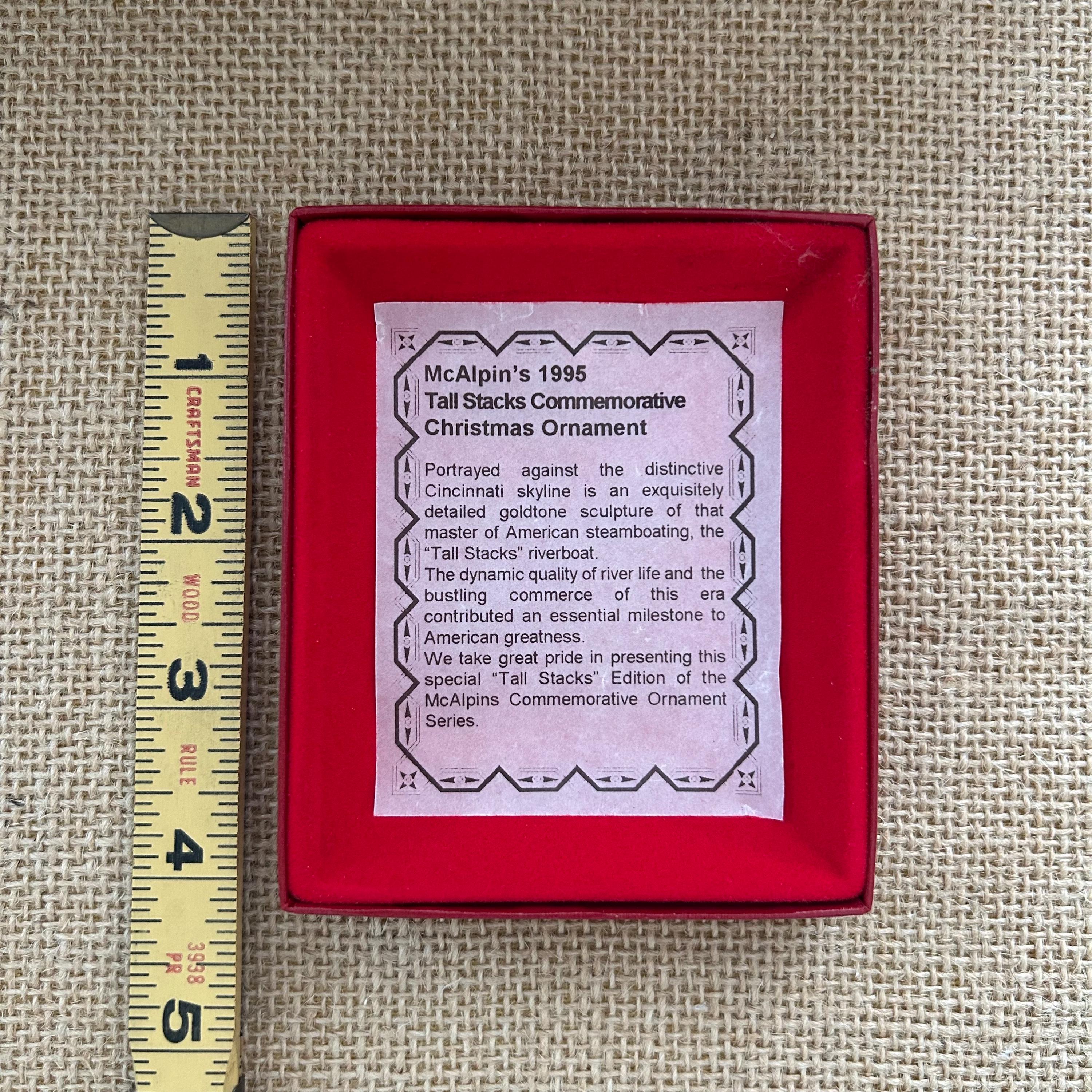 Celebrate Cincinnati history with this exquisite 1995 McAlpin’s Tall Stacks Commemorative Christmas Ornament, crafted with a 24-karat gold finish and presented in its original red McAlpin’s box.