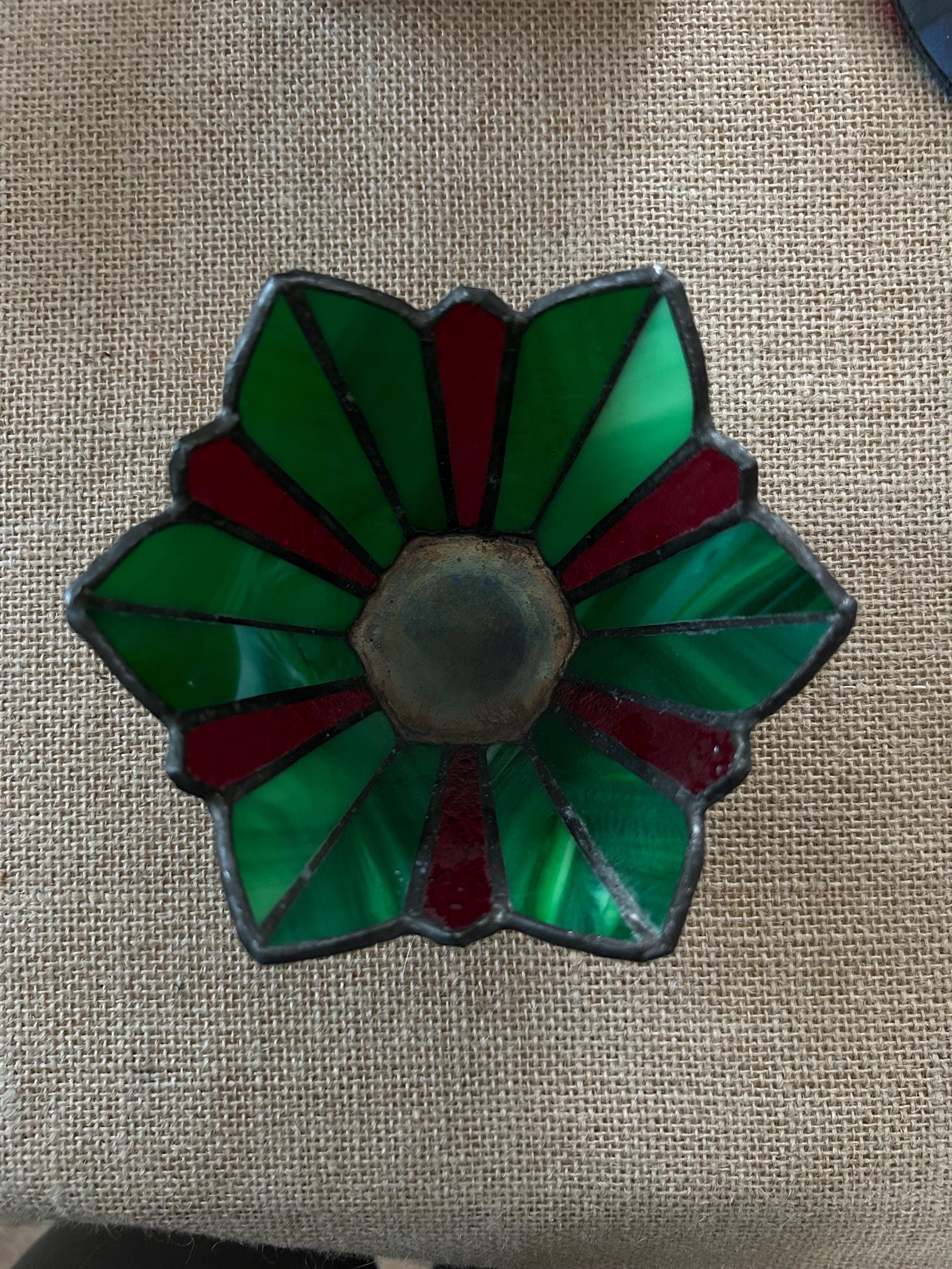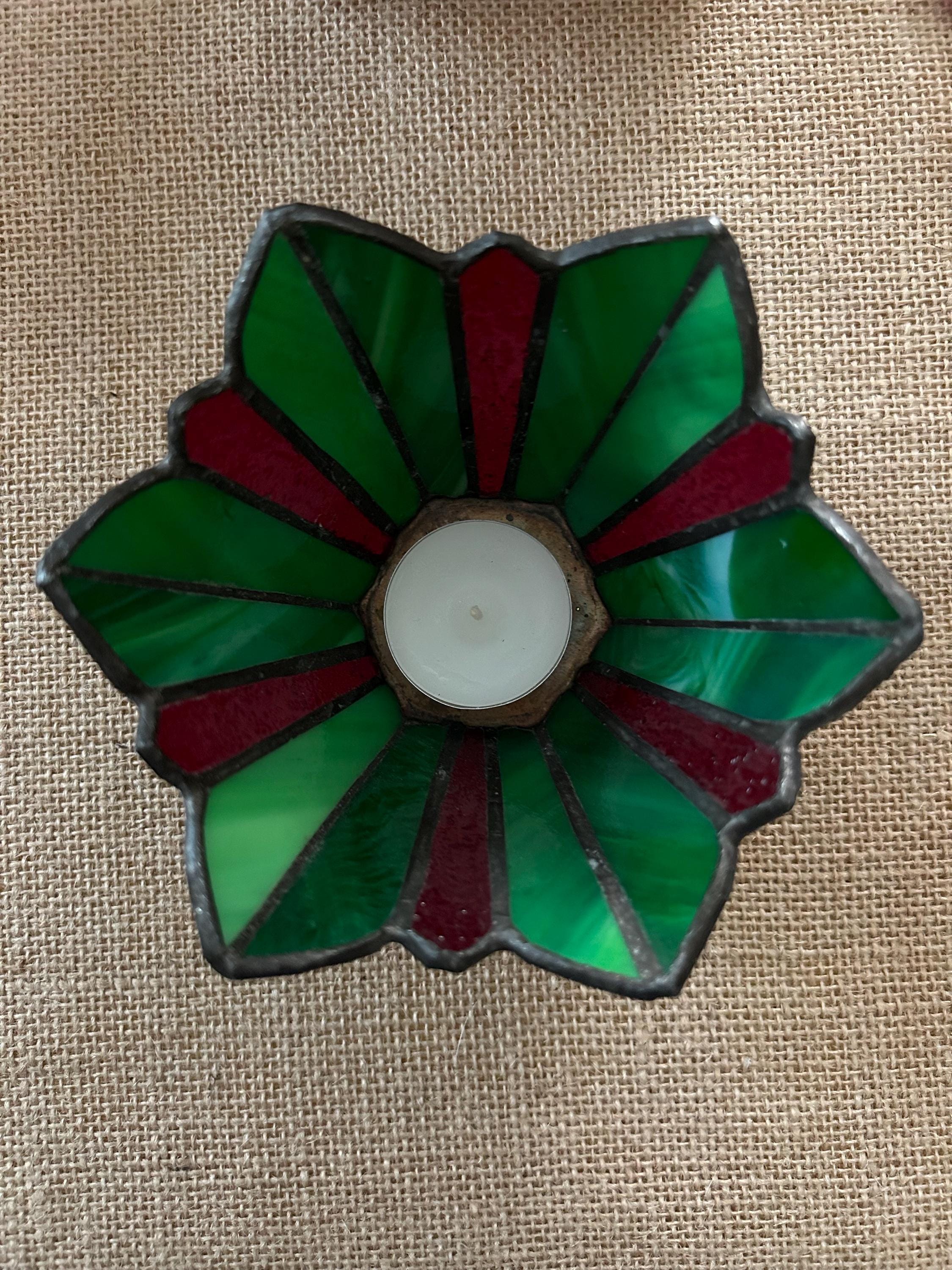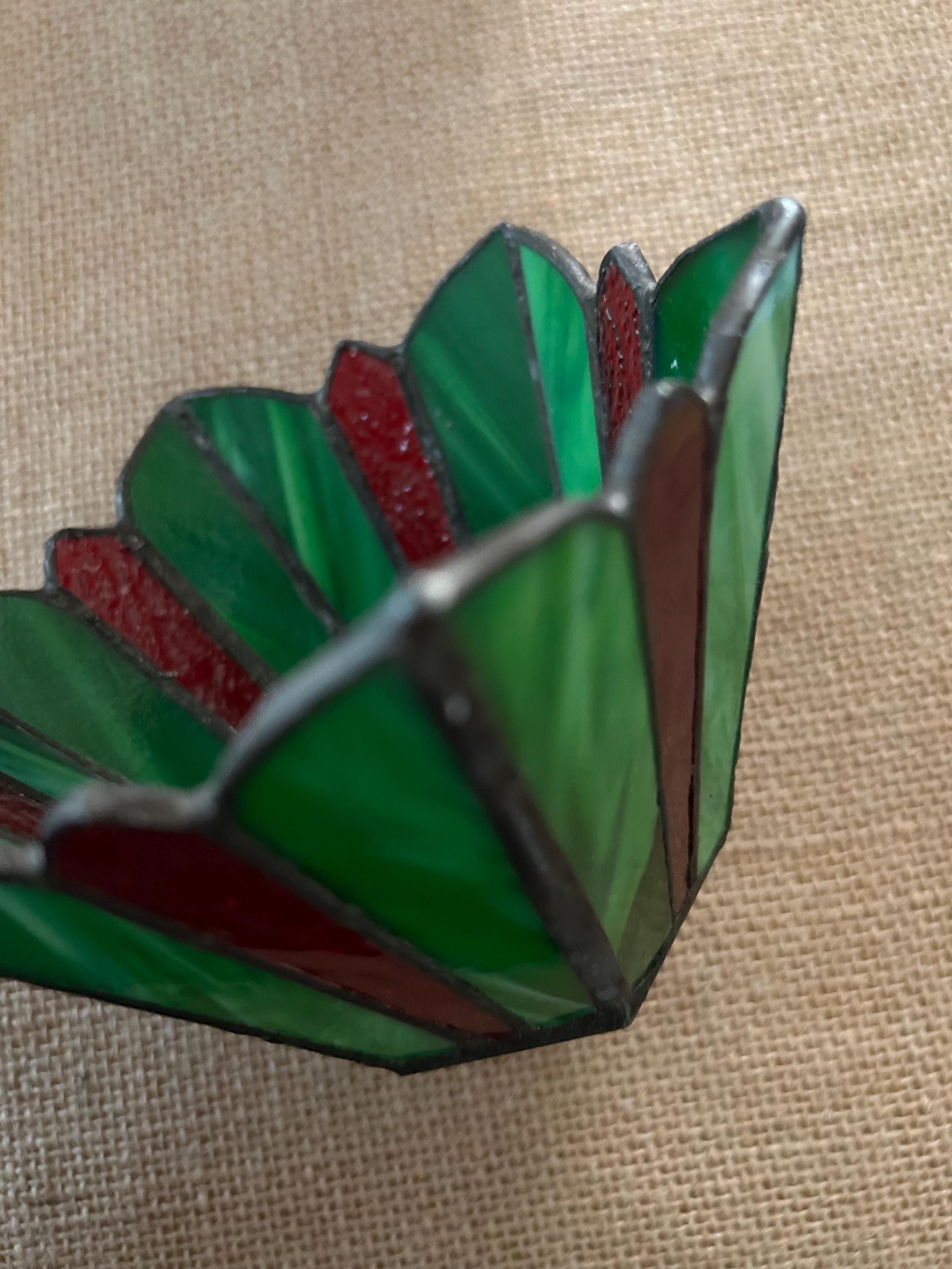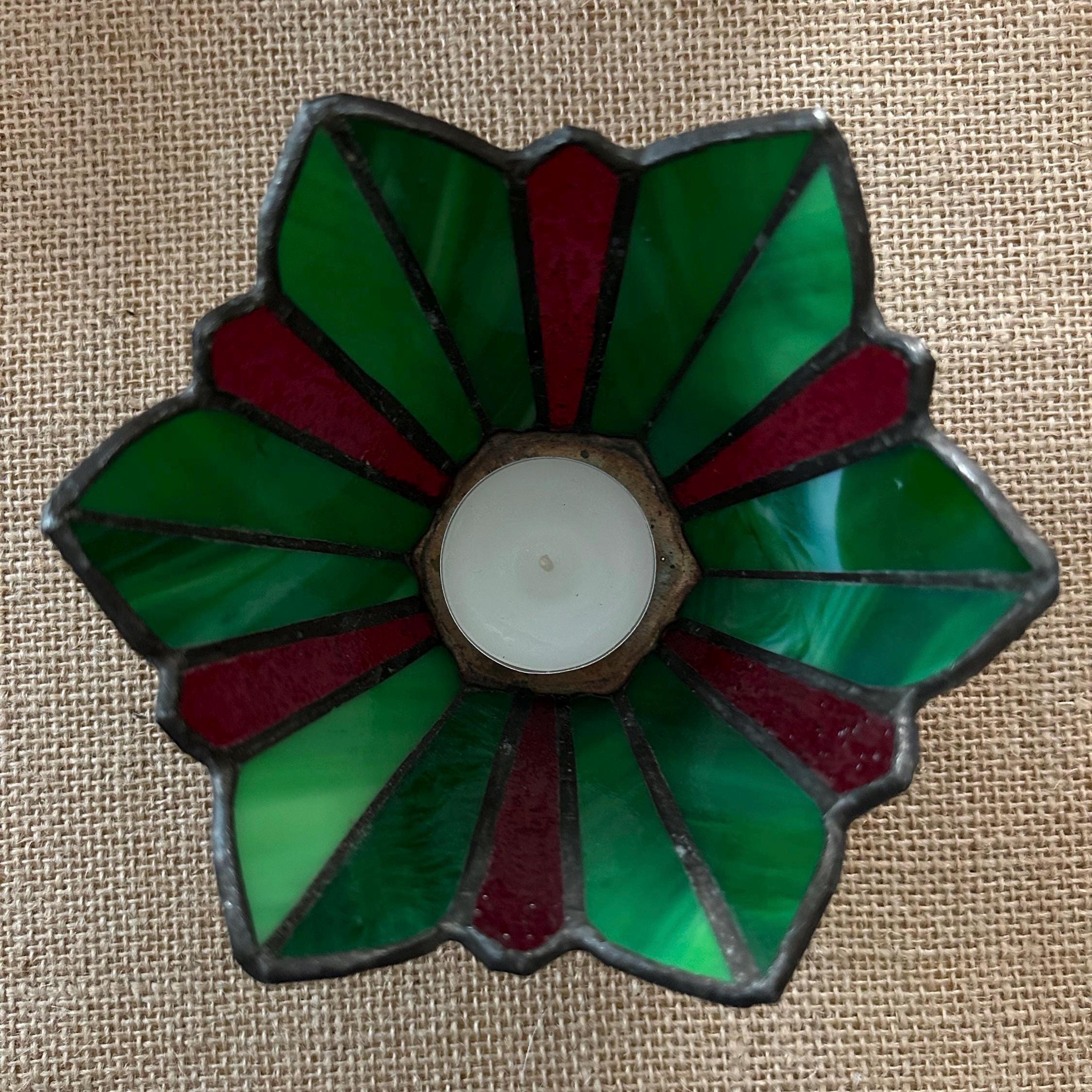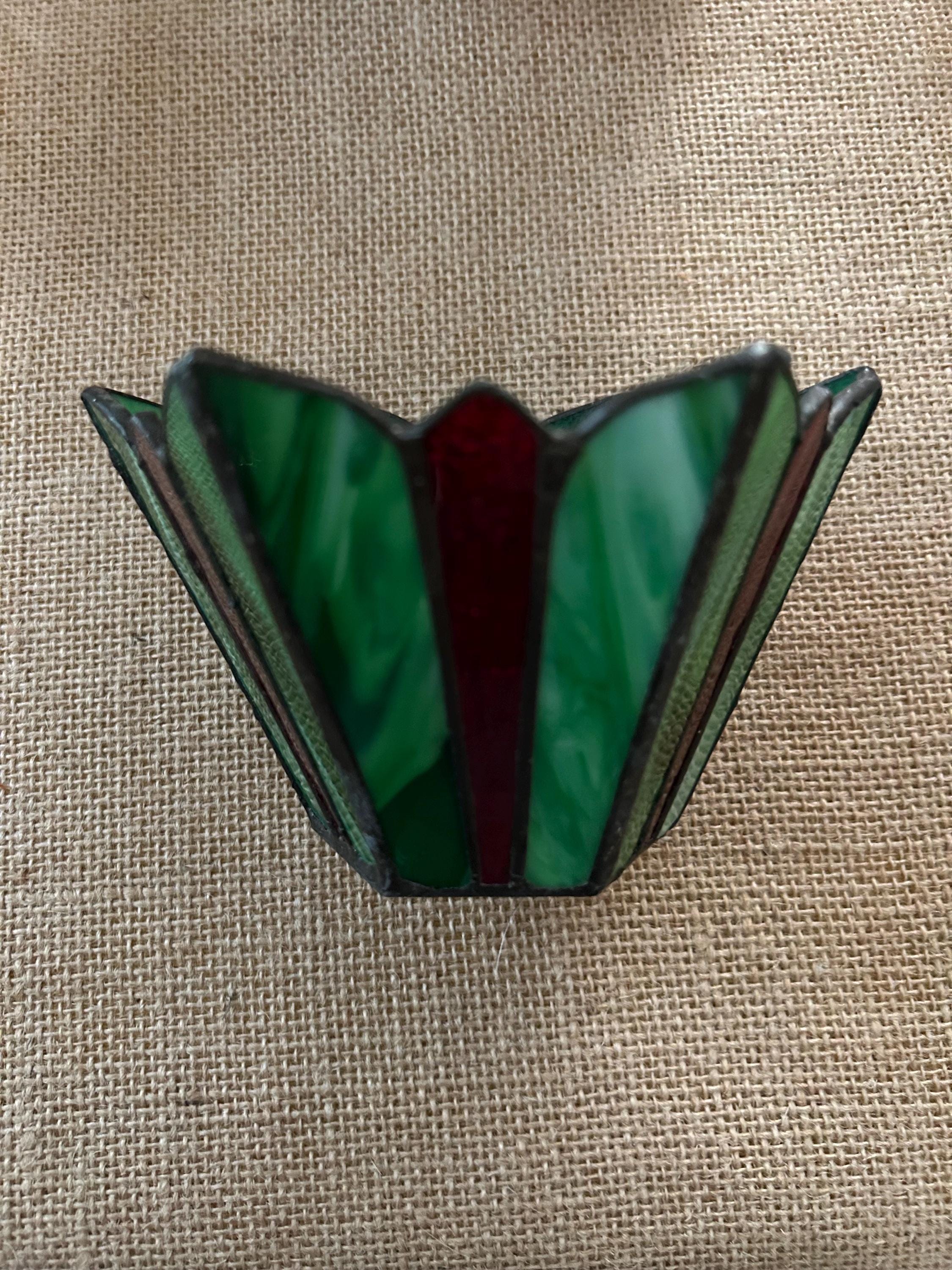 This beautiful vintage stained glass votive candle holder features deep emerald green and ruby red glass panels arranged in a petal-like floral design. The piece has a leaded metal frame and a rich, handcrafted look reminiscent of Tiffany-style stained glass.