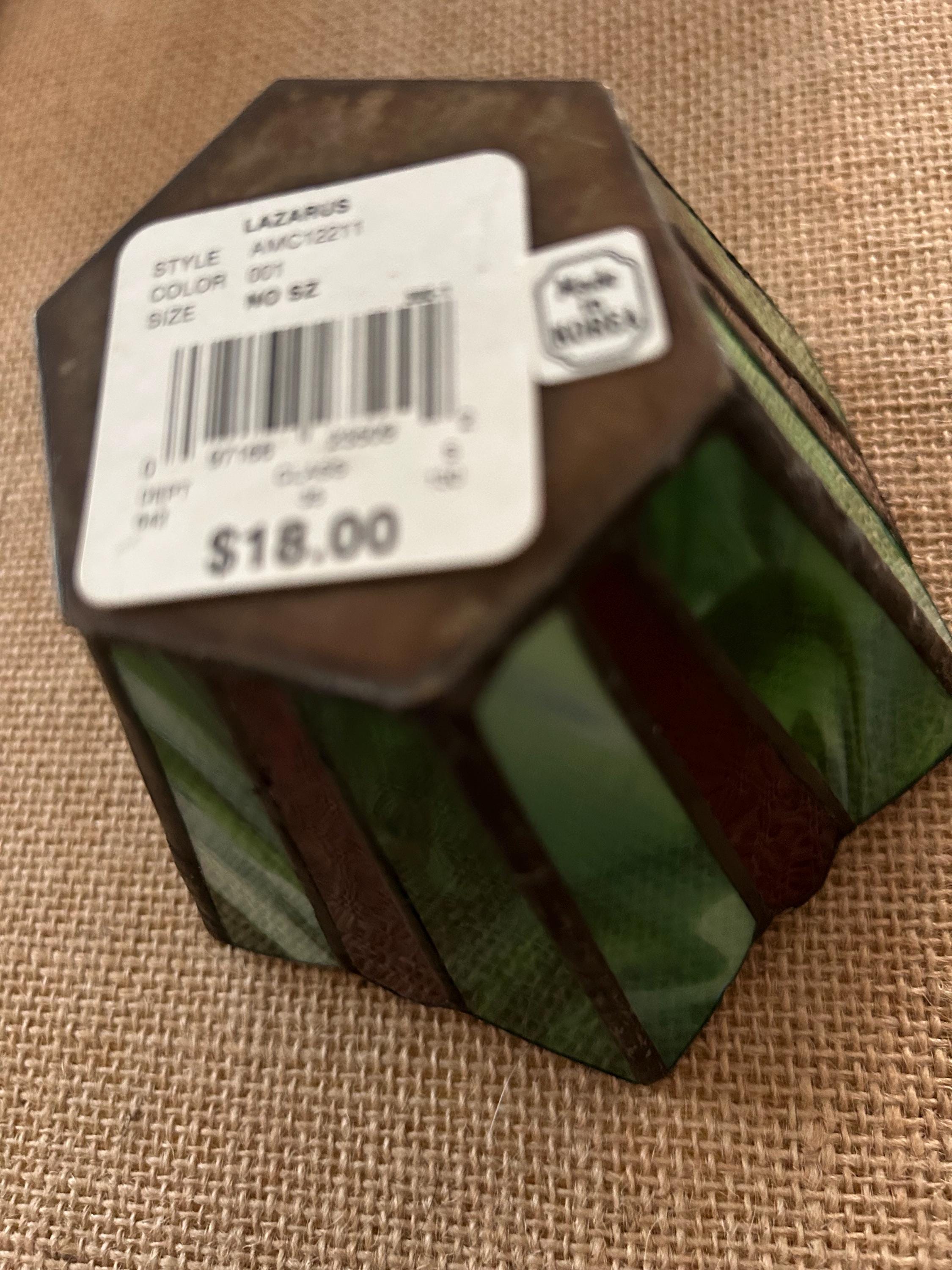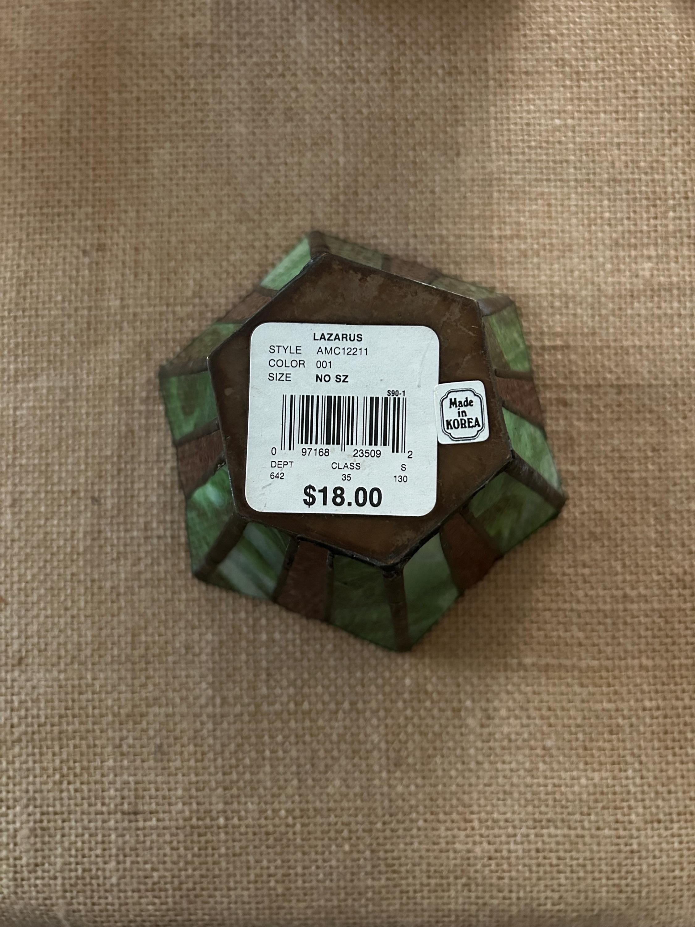 Still bearing its original Lazarus department store tag and marked Made in Korea, this charming accent likely dates to the 1980s or early 1990s, when stained glass décor was popular for both holiday and year-round display.