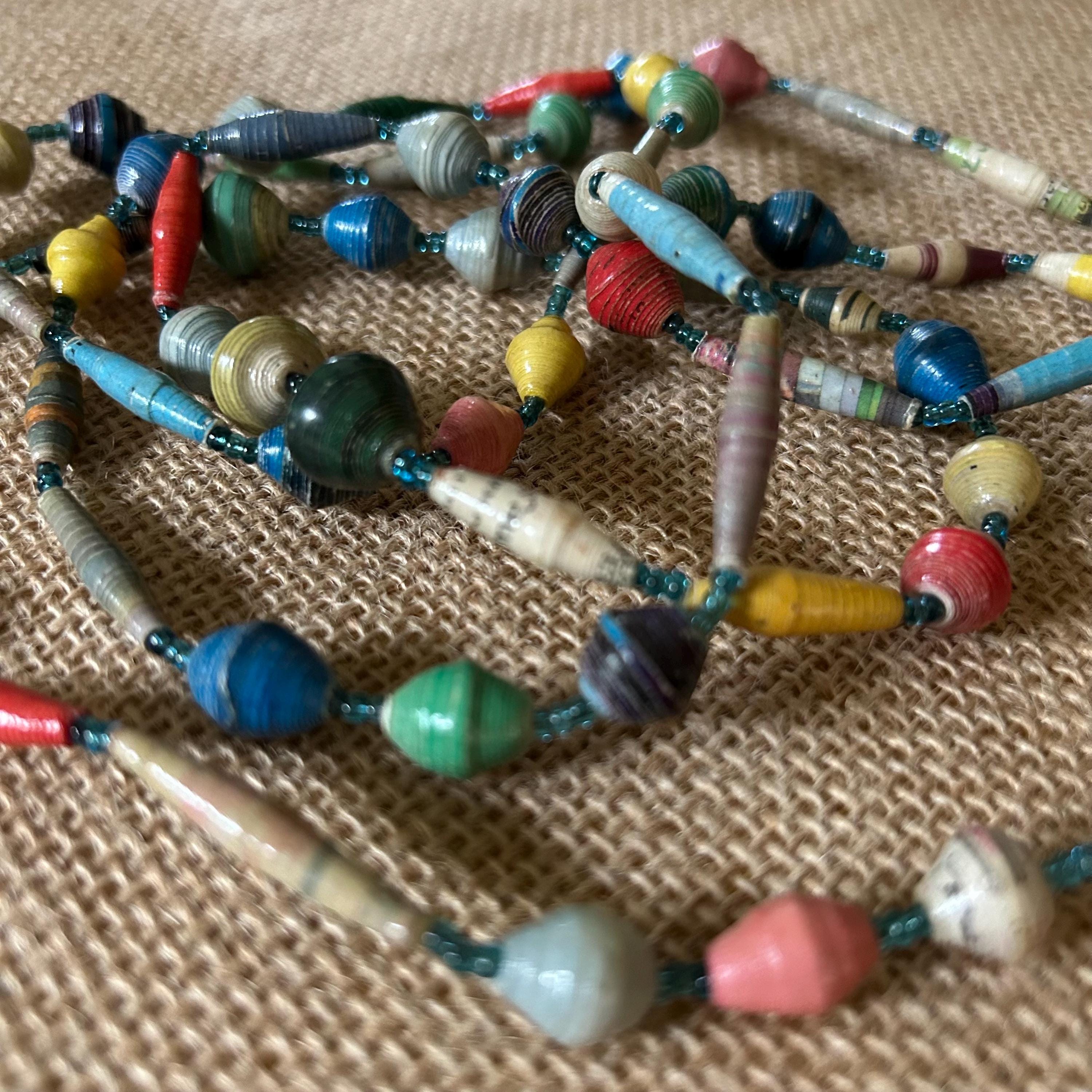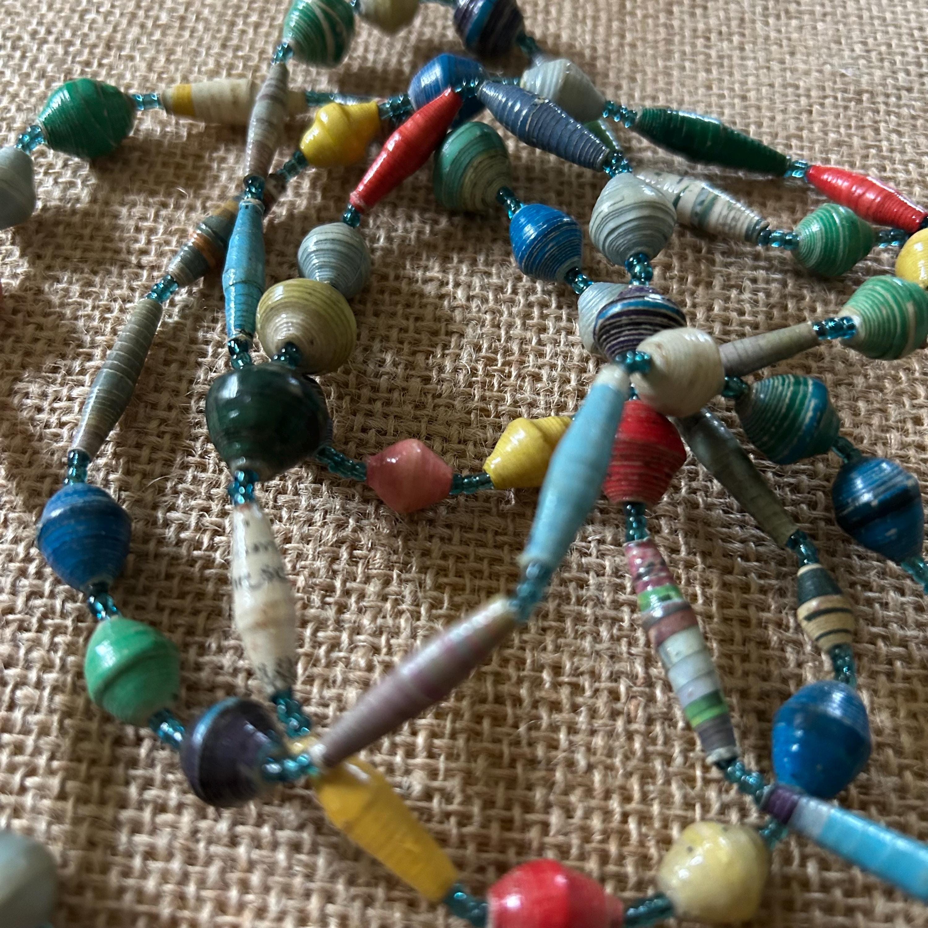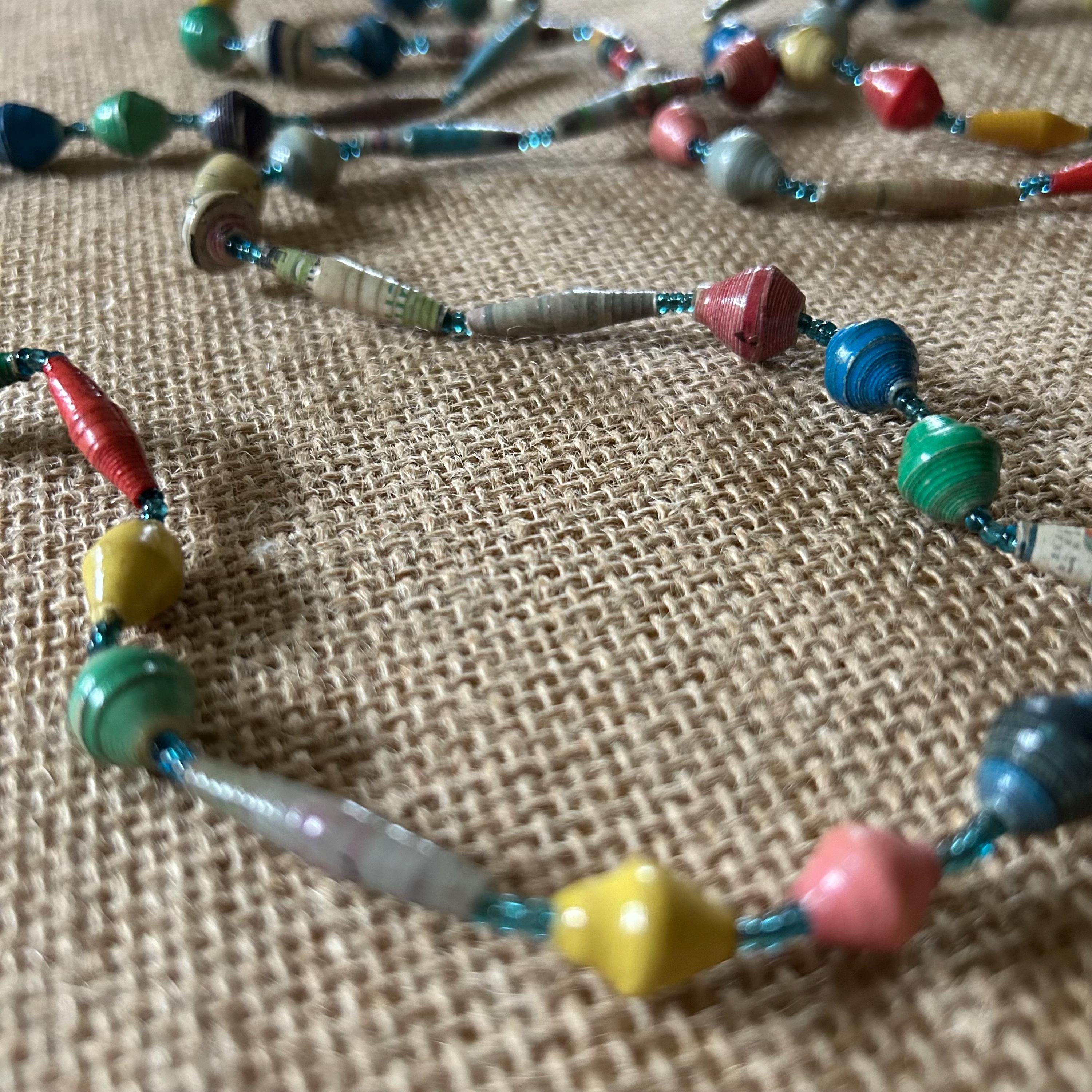 Each bead is hand-rolled from recycled paper, then sealed to a glossy finish — creating a one-of-a-kind blend of texture, pattern, and hue. The necklace features a joyful rainbow palette: rich blues, greens, yellows, pinks, and reds, all strung on shimmering thread with petite glass spacers for a touch of sparkle.