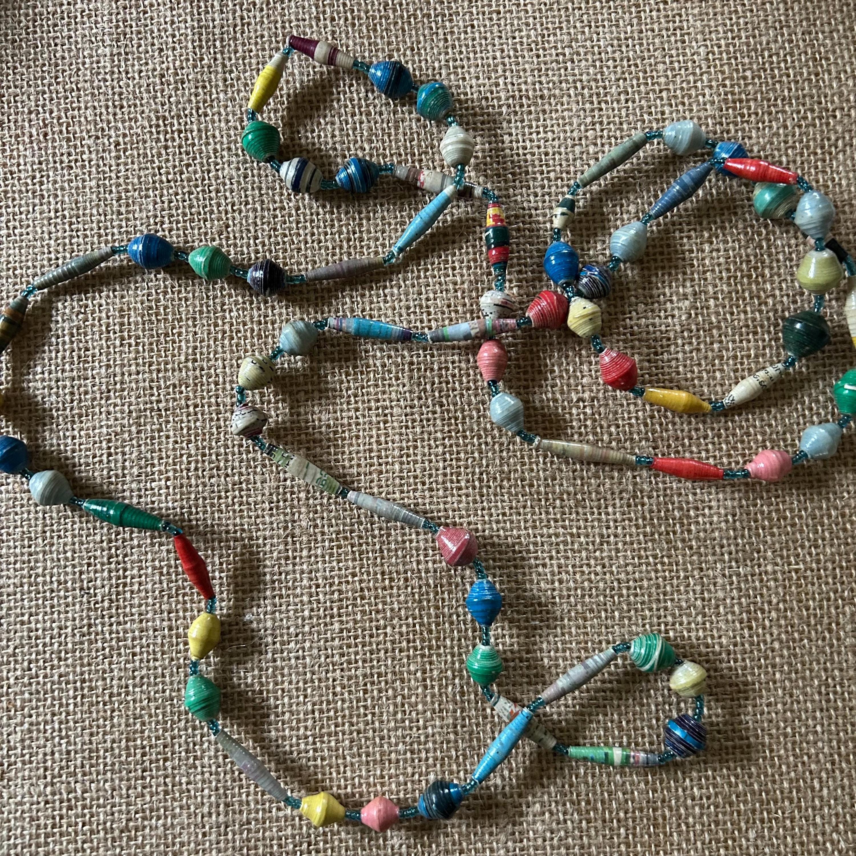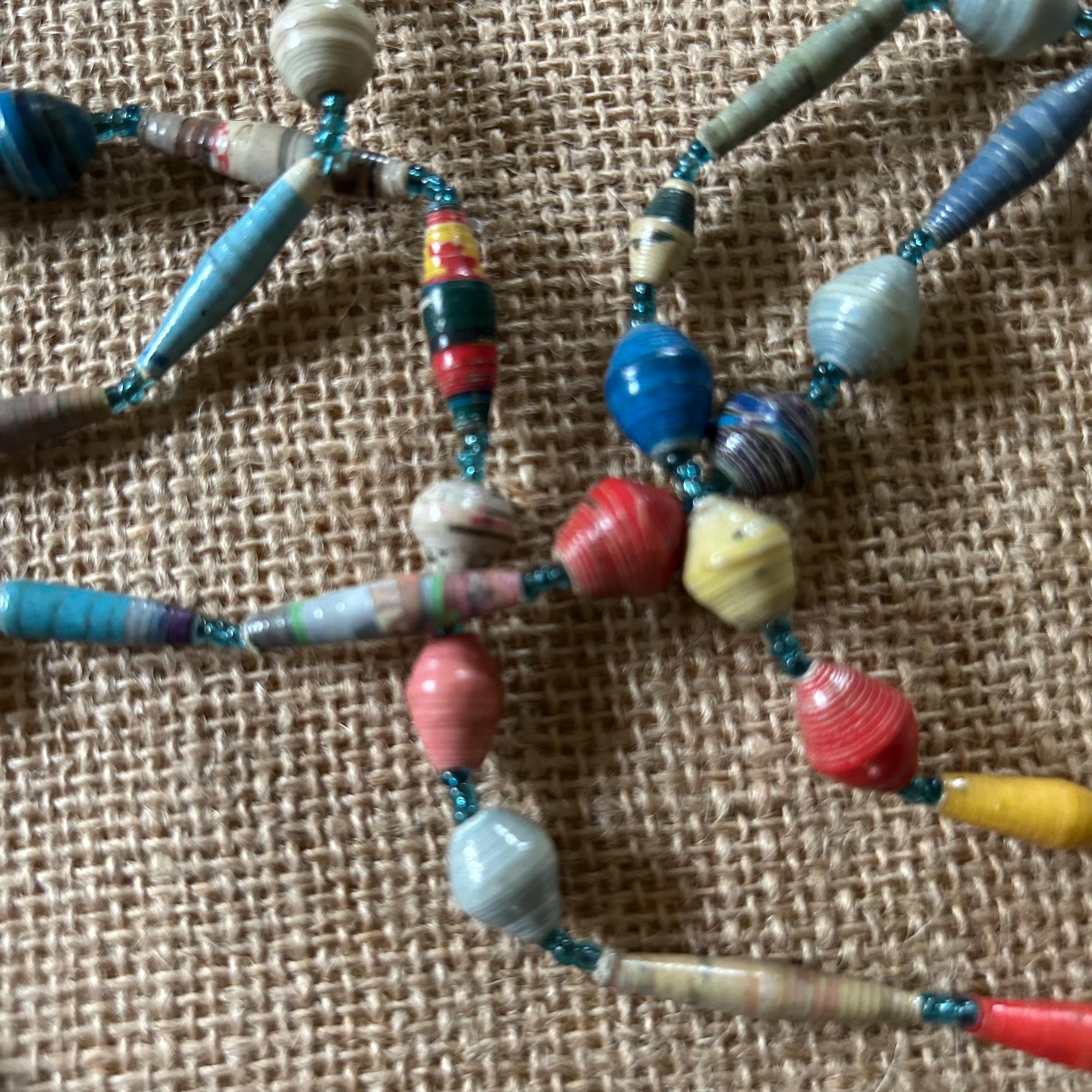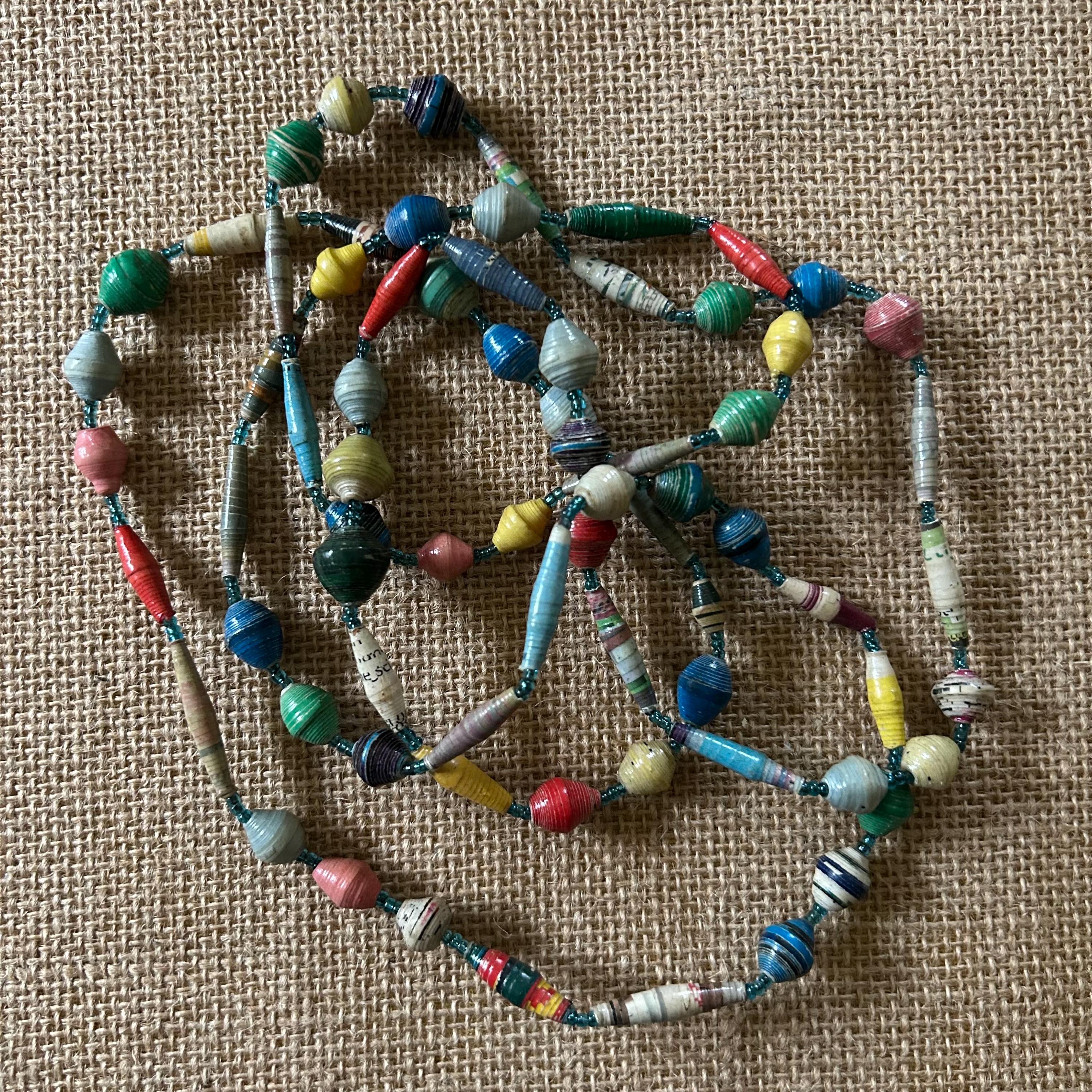 Each bead is hand-rolled from recycled paper, then sealed to a glossy finish — creating a one-of-a-kind blend of texture, pattern, and hue. The necklace features a joyful rainbow palette: rich blues, greens, yellows, pinks, and reds, all strung on shimmering thread with petite glass spacers for a touch of sparkle.