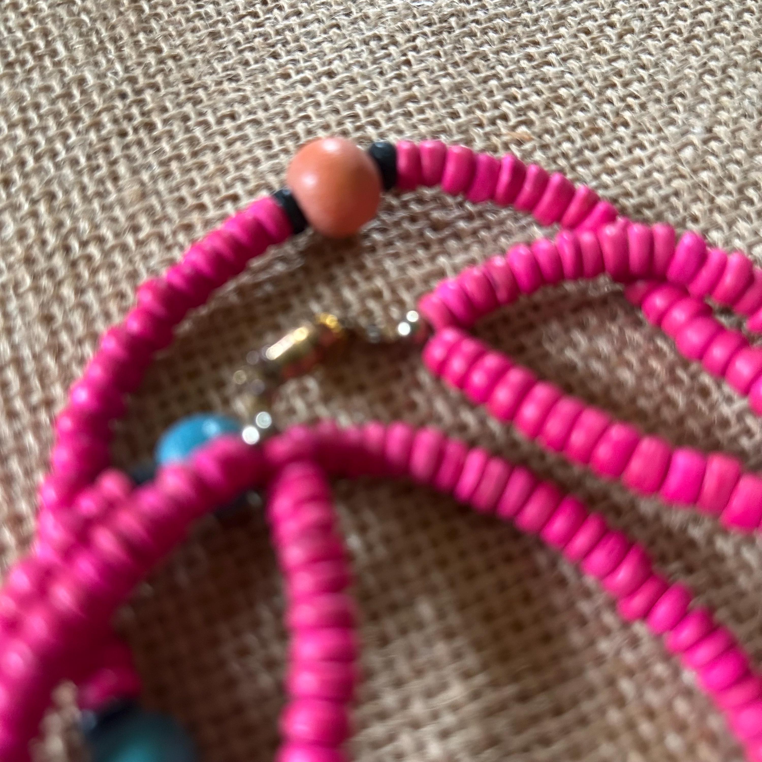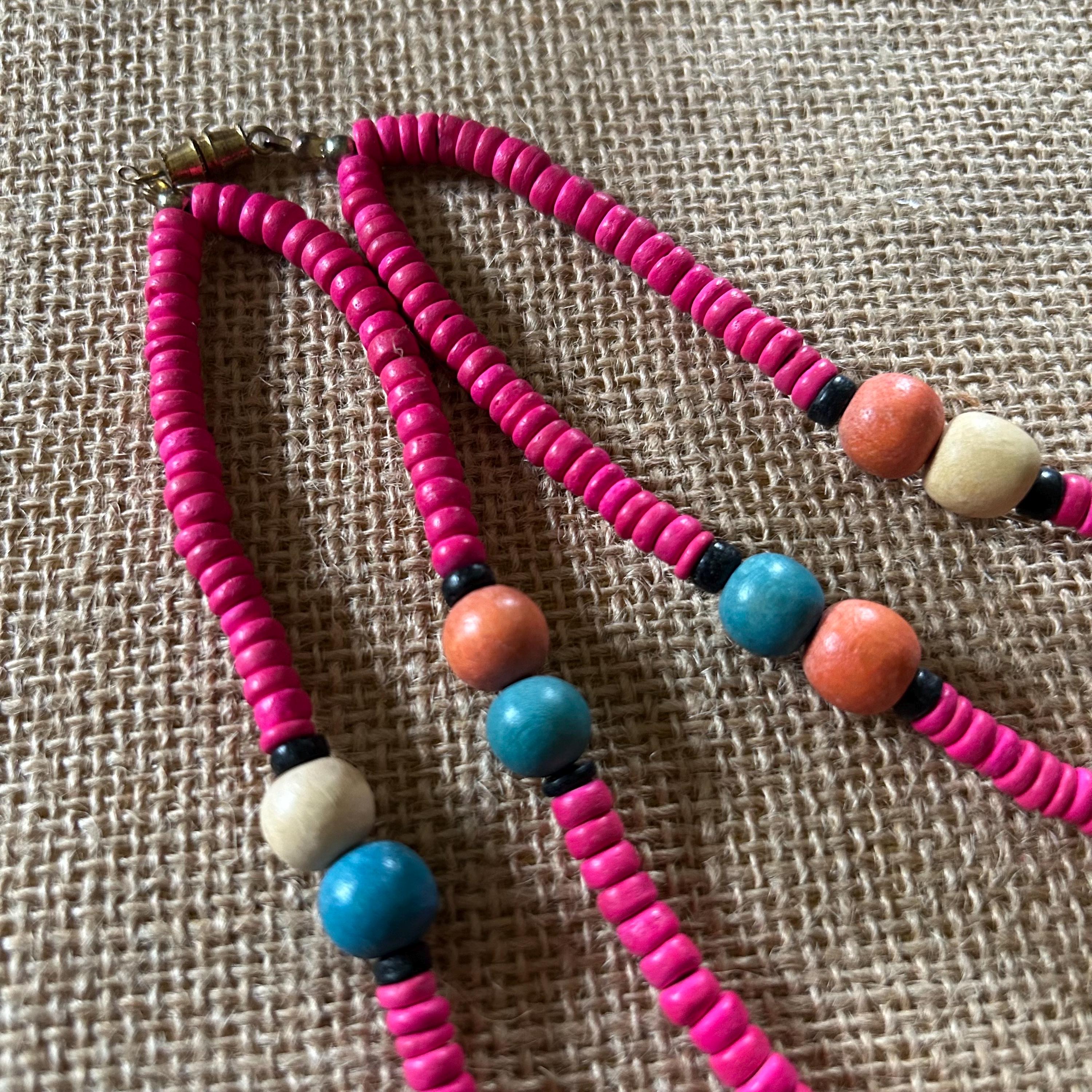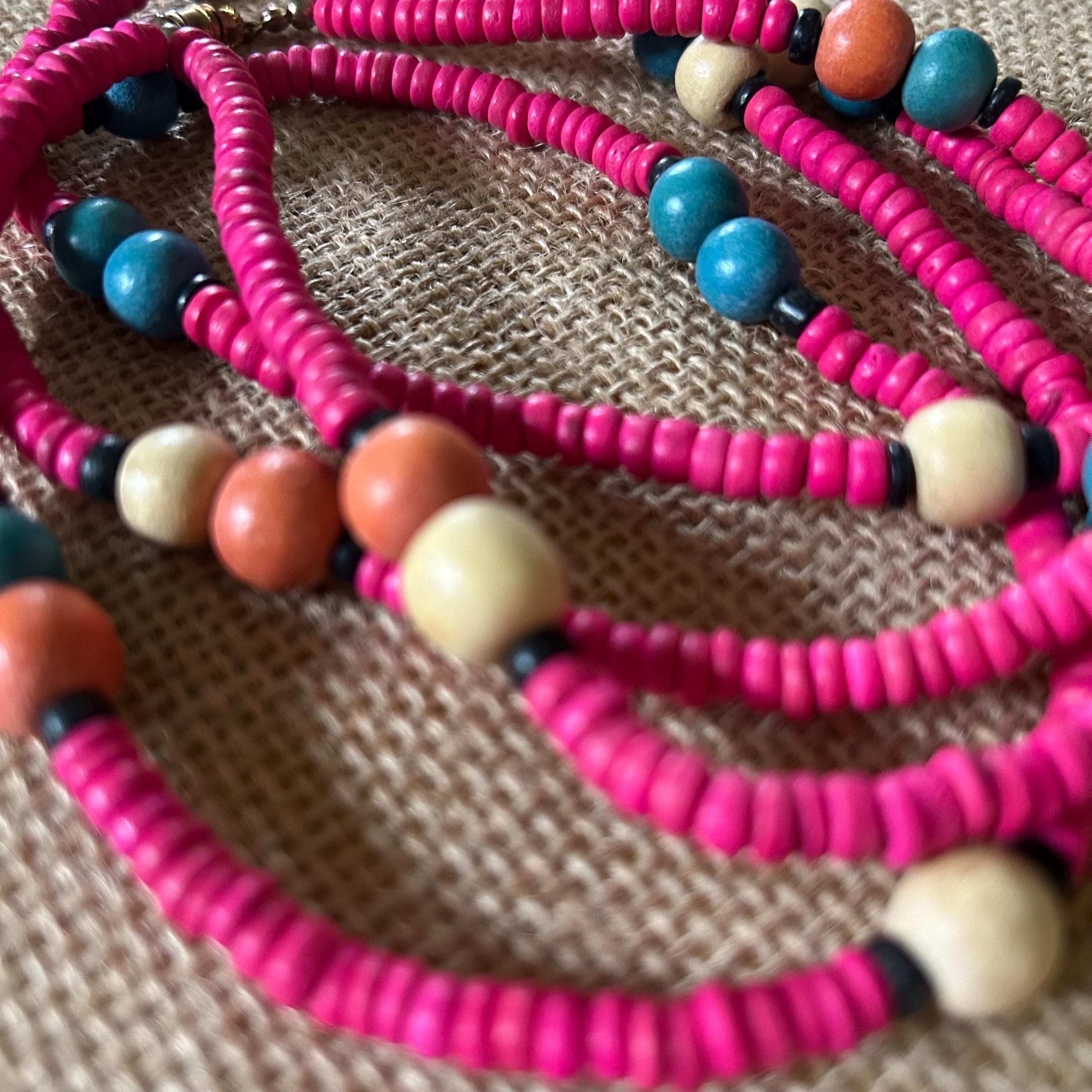This eye-catching layered piece captures the bold and playful spirit of the 1980s, featuring vibrant magenta disc beads paired with larger round wooden beads in turquoise blue, coral orange, and cream. It’s lightweight, fun to wear, and adds a perfect pop of retro flair to any outfit.