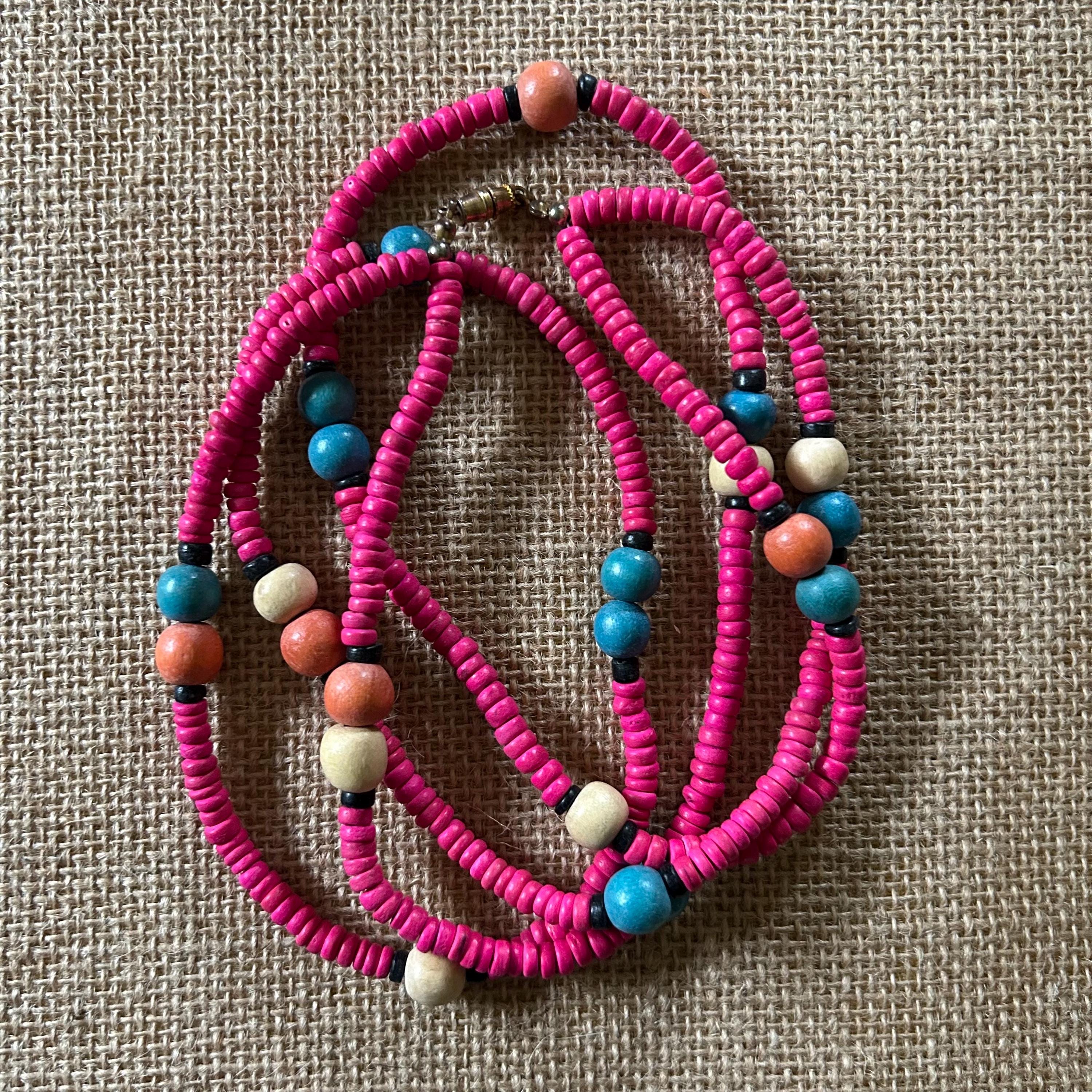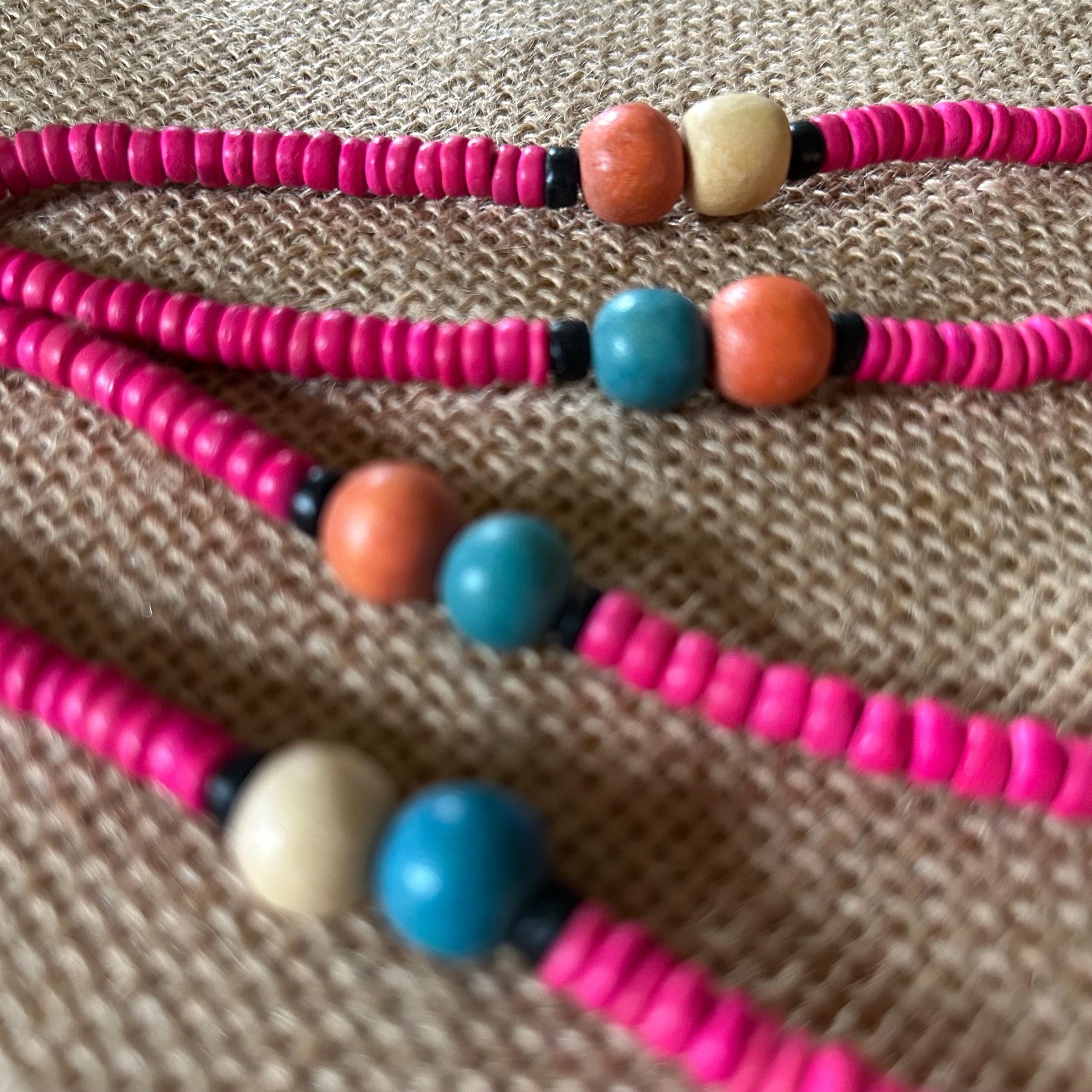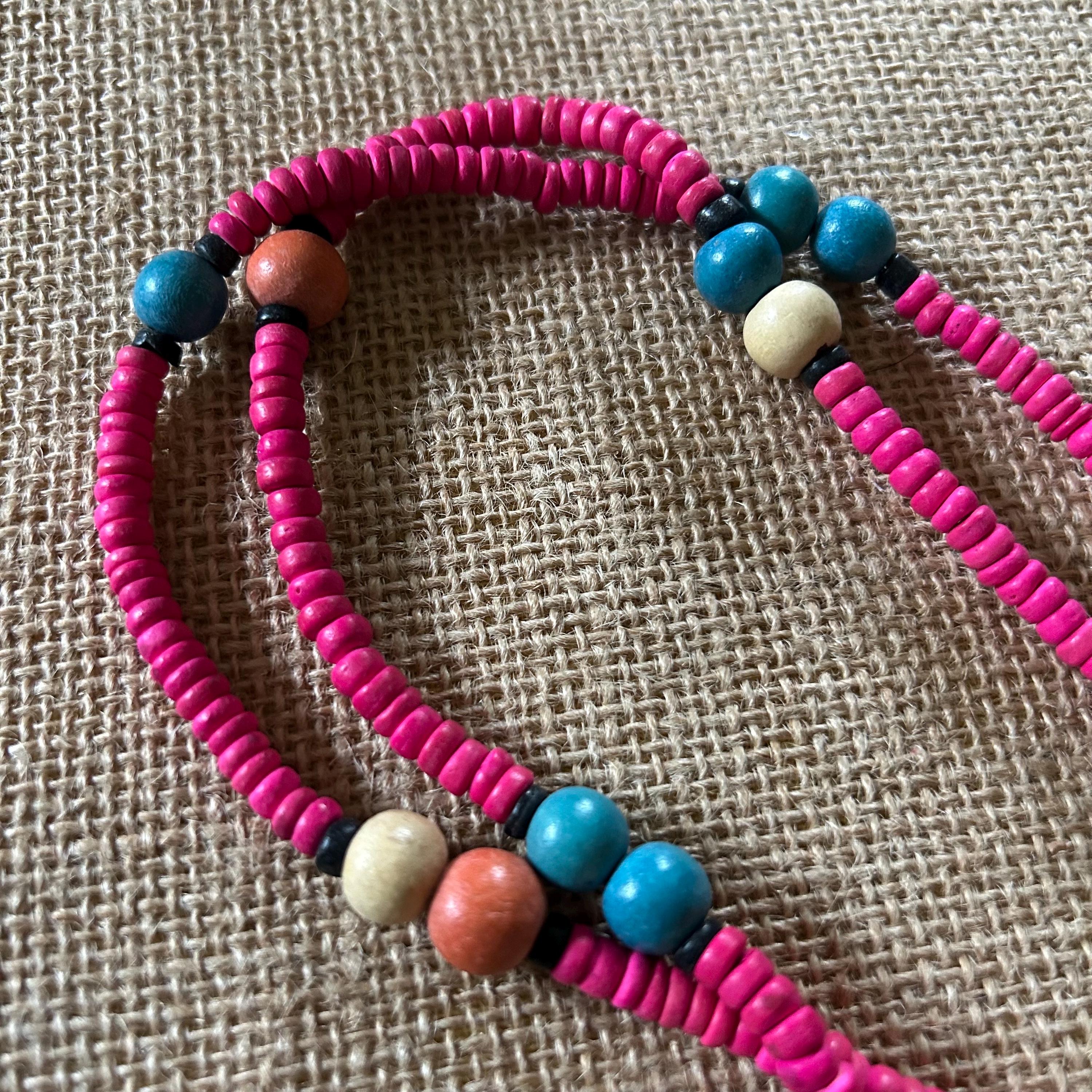 This eye-catching layered piece captures the bold and playful spirit of the 1980s, featuring vibrant magenta disc beads paired with larger round wooden beads in turquoise blue, coral orange, and cream. It’s lightweight, fun to wear, and adds a perfect pop of retro flair to any outfit.
