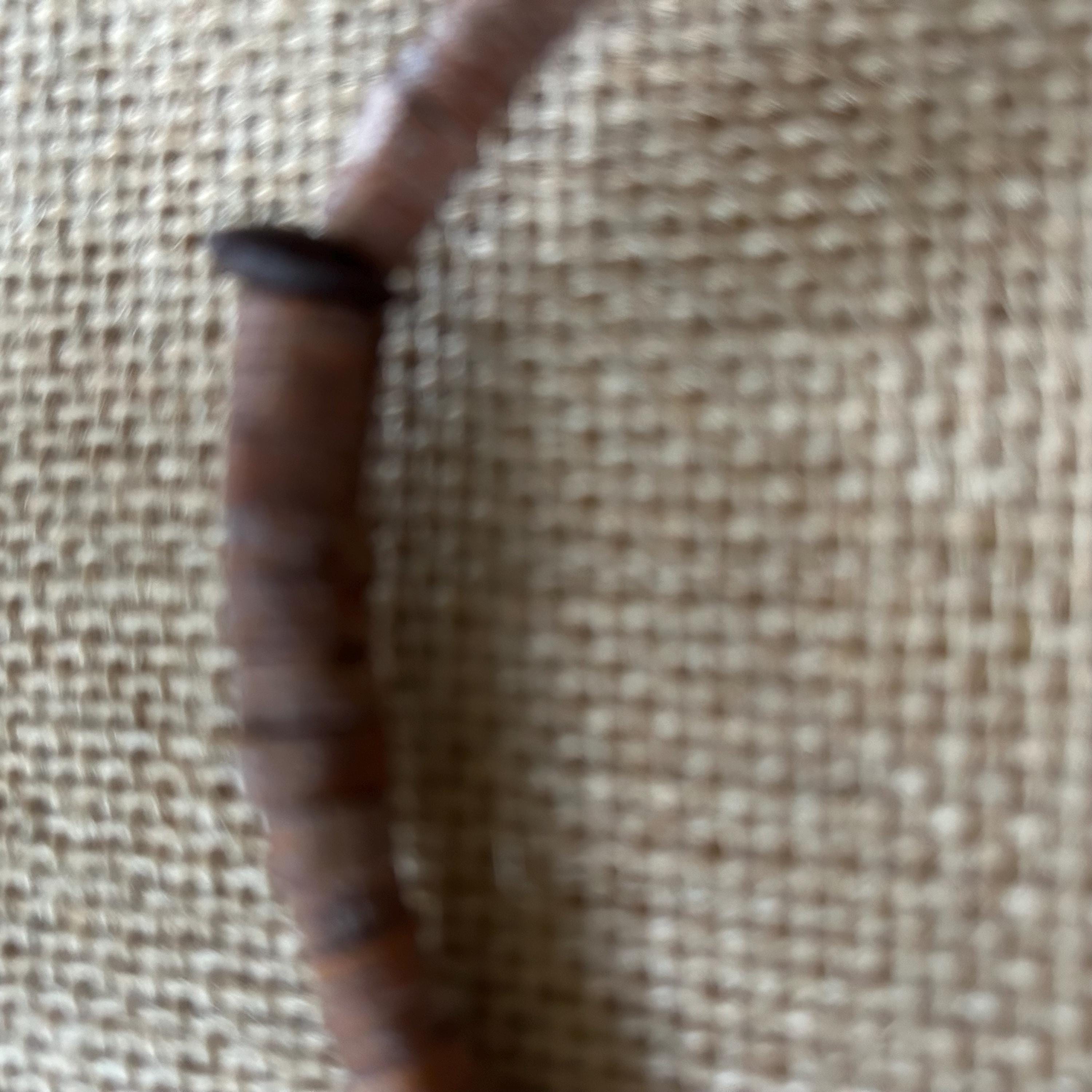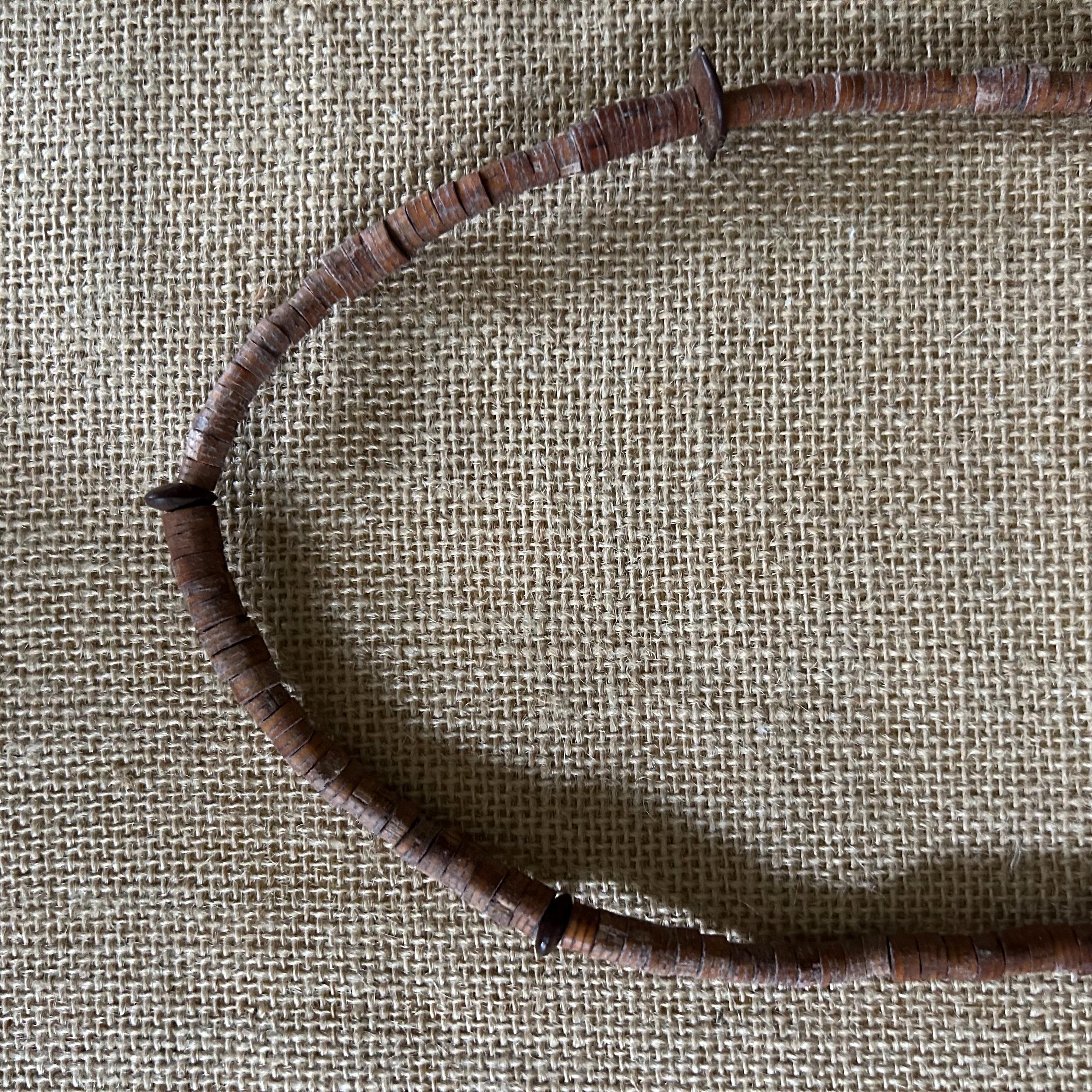 • Materials: Carved wood, coconut shell discs, painted beads, natural fiber cord