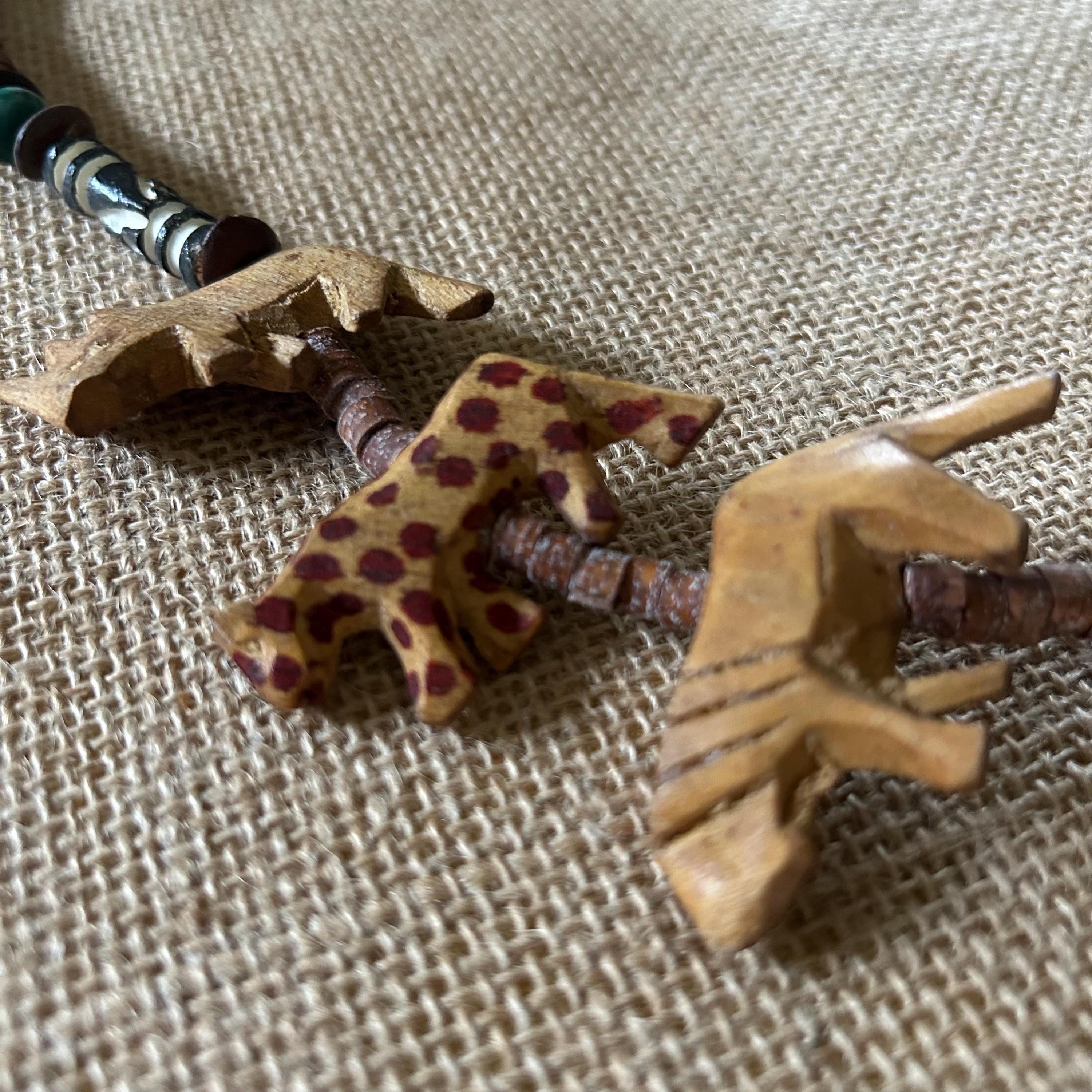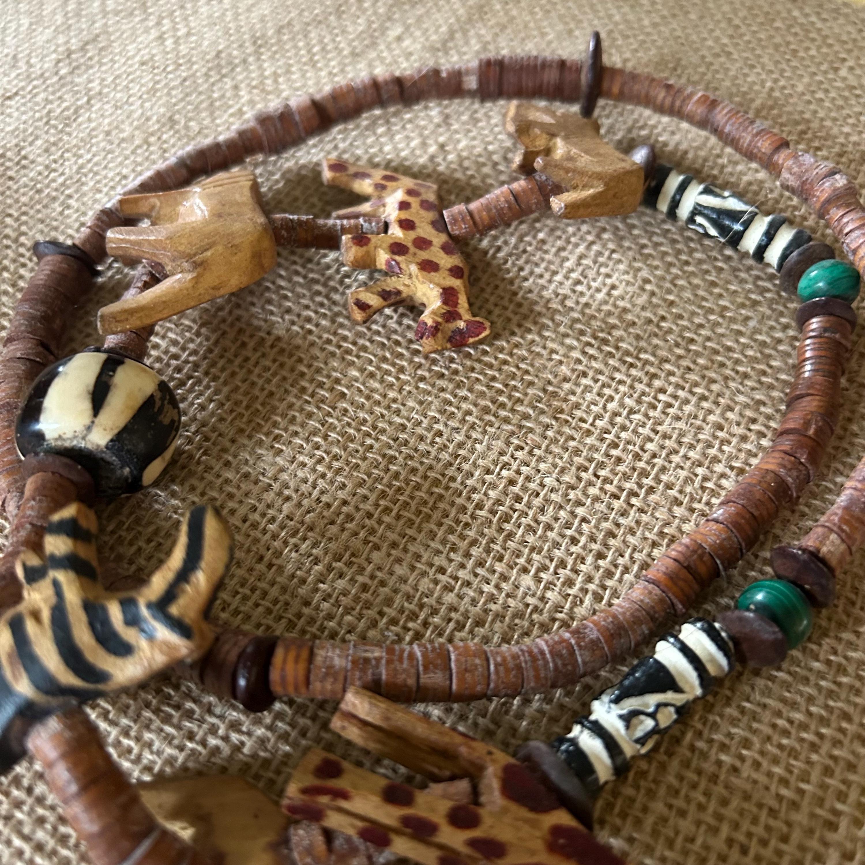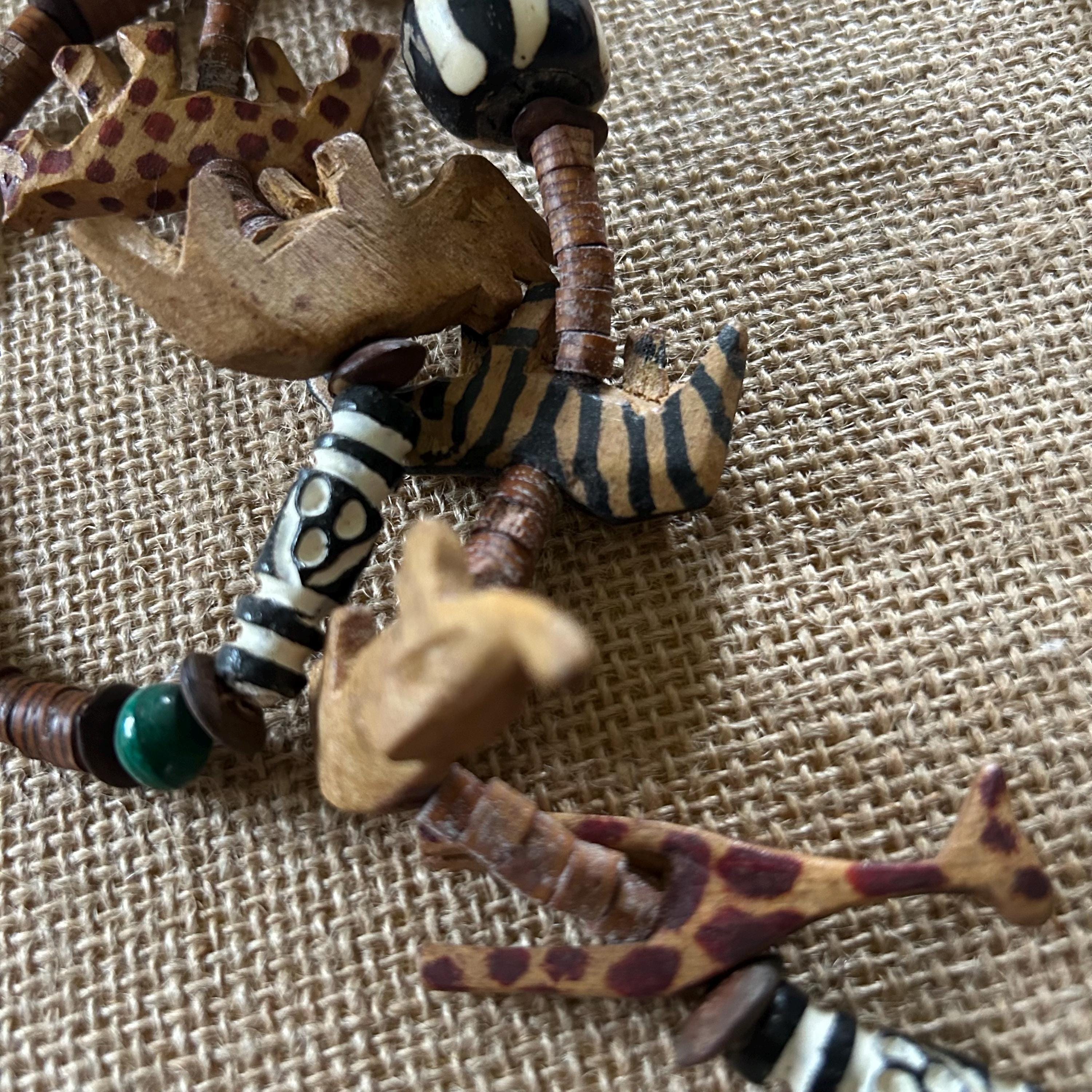 This distinctive piece features carved animal charms — giraffe, zebra, and elephant — interspersed with earthy coconut shell discs and hand-painted accent beads. Each animal is uniquely detailed, celebrating the craftsmanship and natural textures typical of 1970s–1980s African-inspired jewelry.