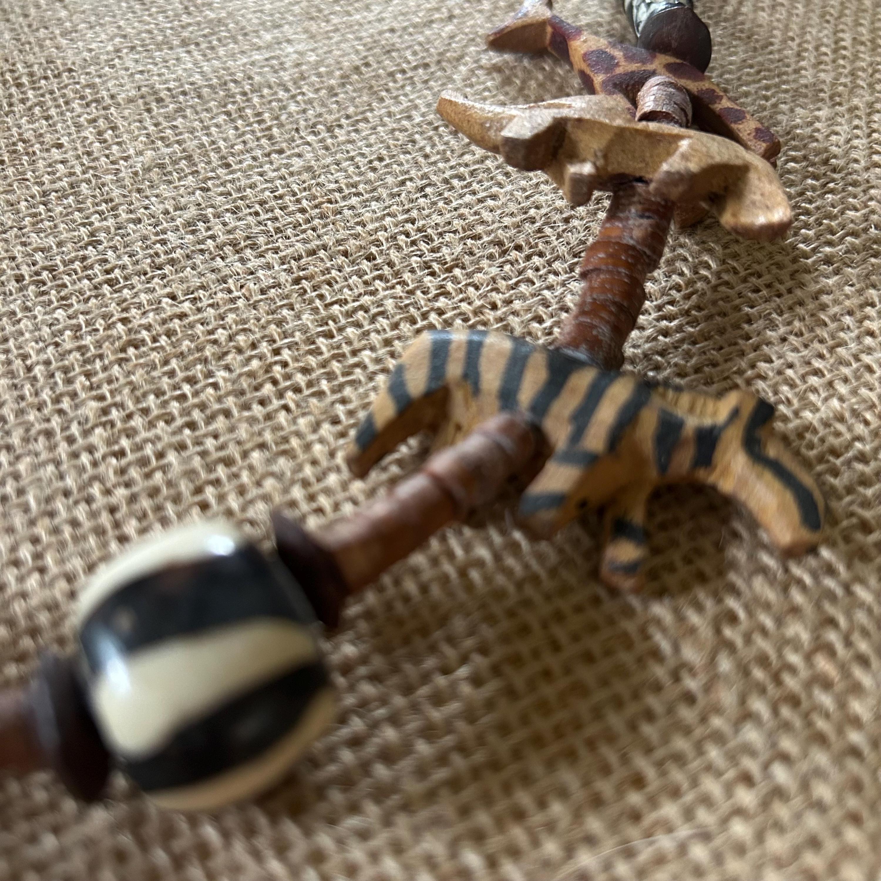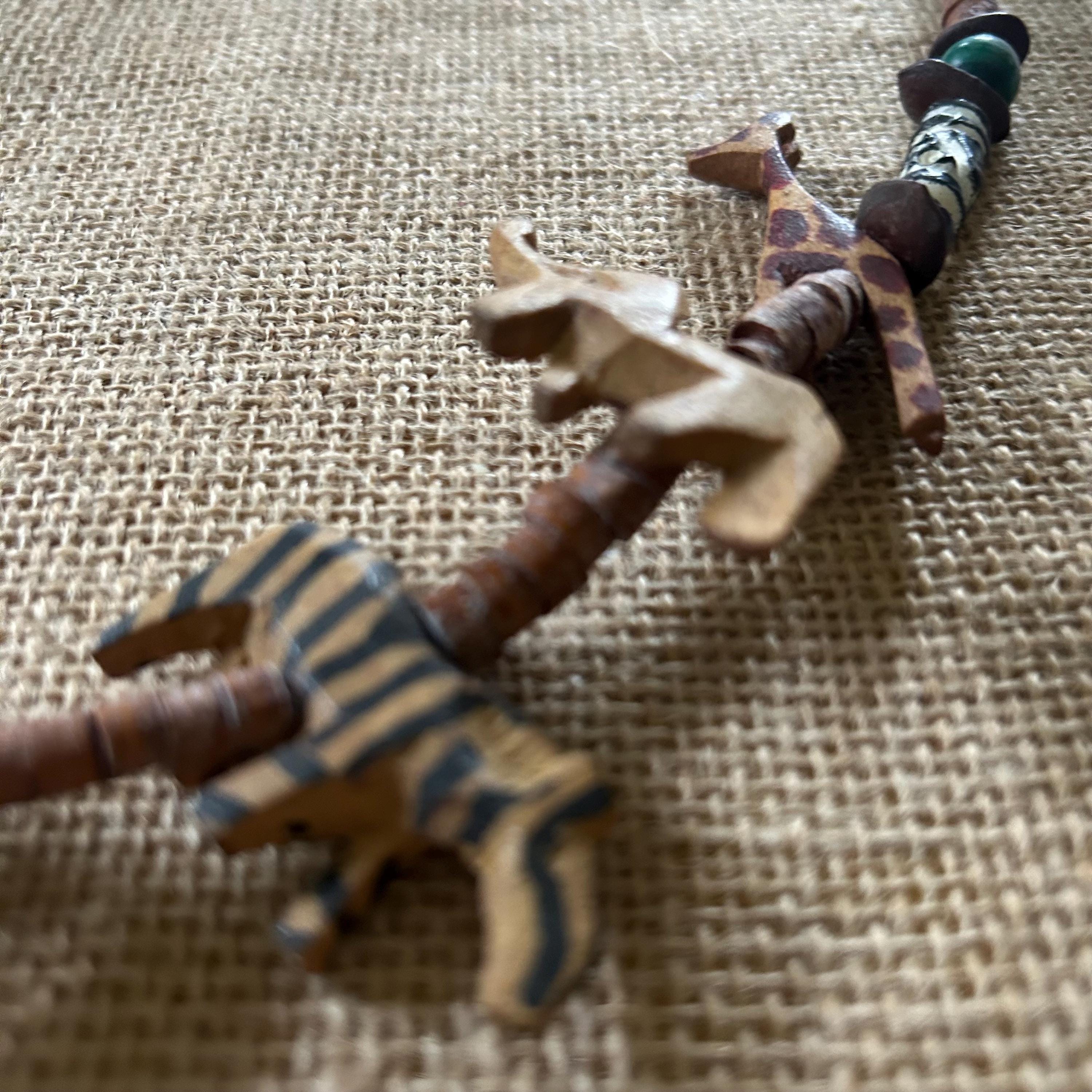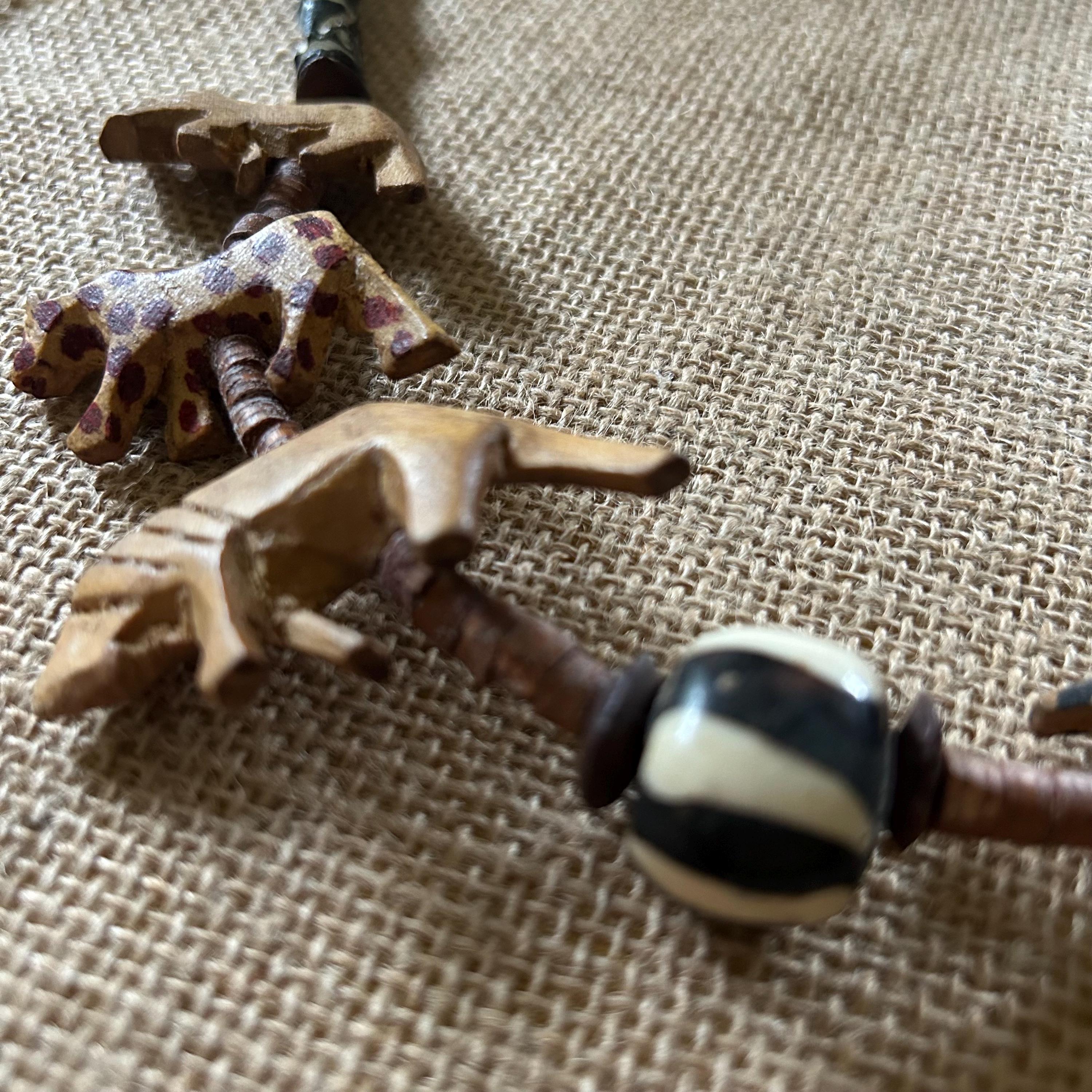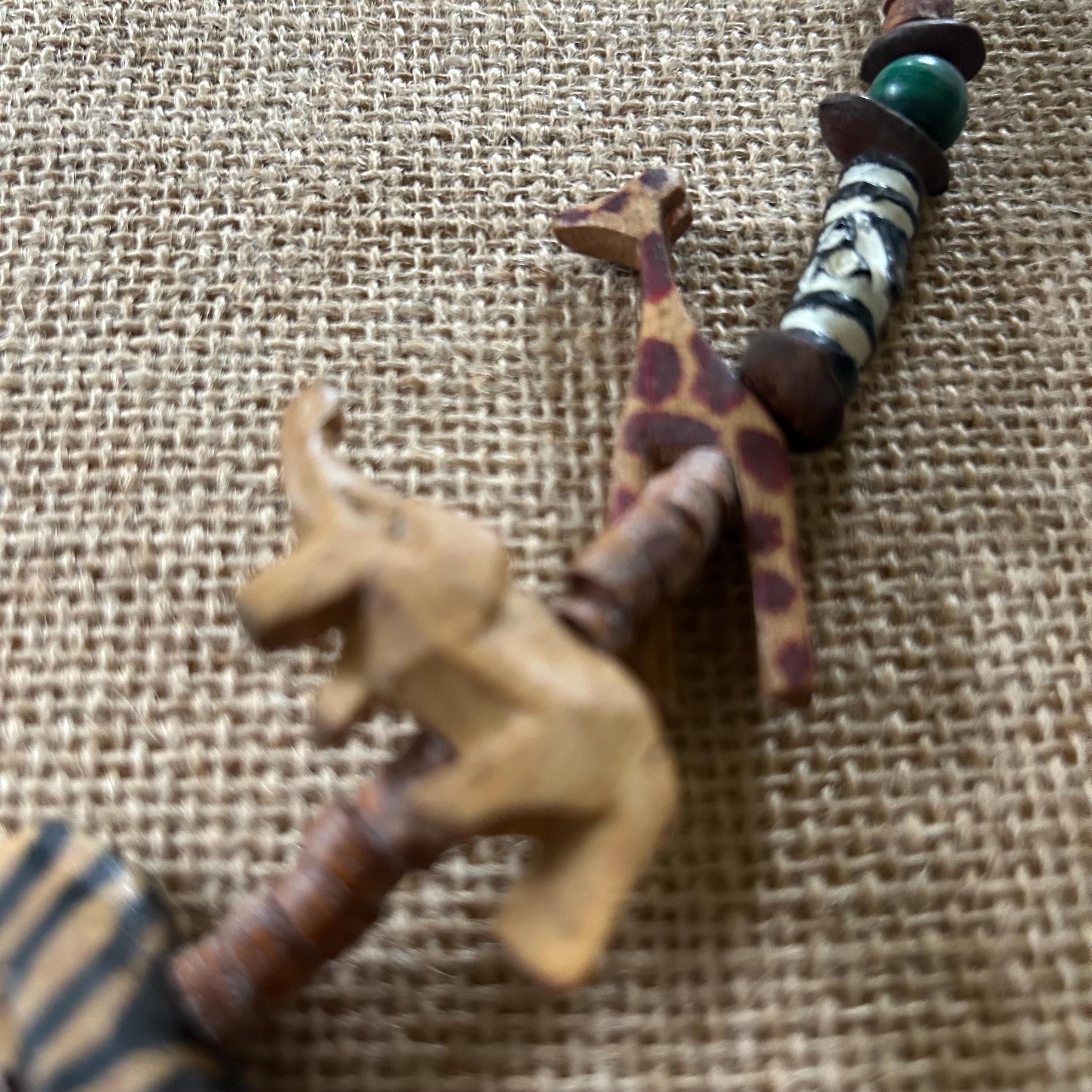 This distinctive piece features carved animal charms — giraffe, zebra, and elephant — interspersed with earthy coconut shell discs and hand-painted accent beads. Each animal is uniquely detailed, celebrating the craftsmanship and natural textures typical of 1970s–1980s African-inspired jewelry.
