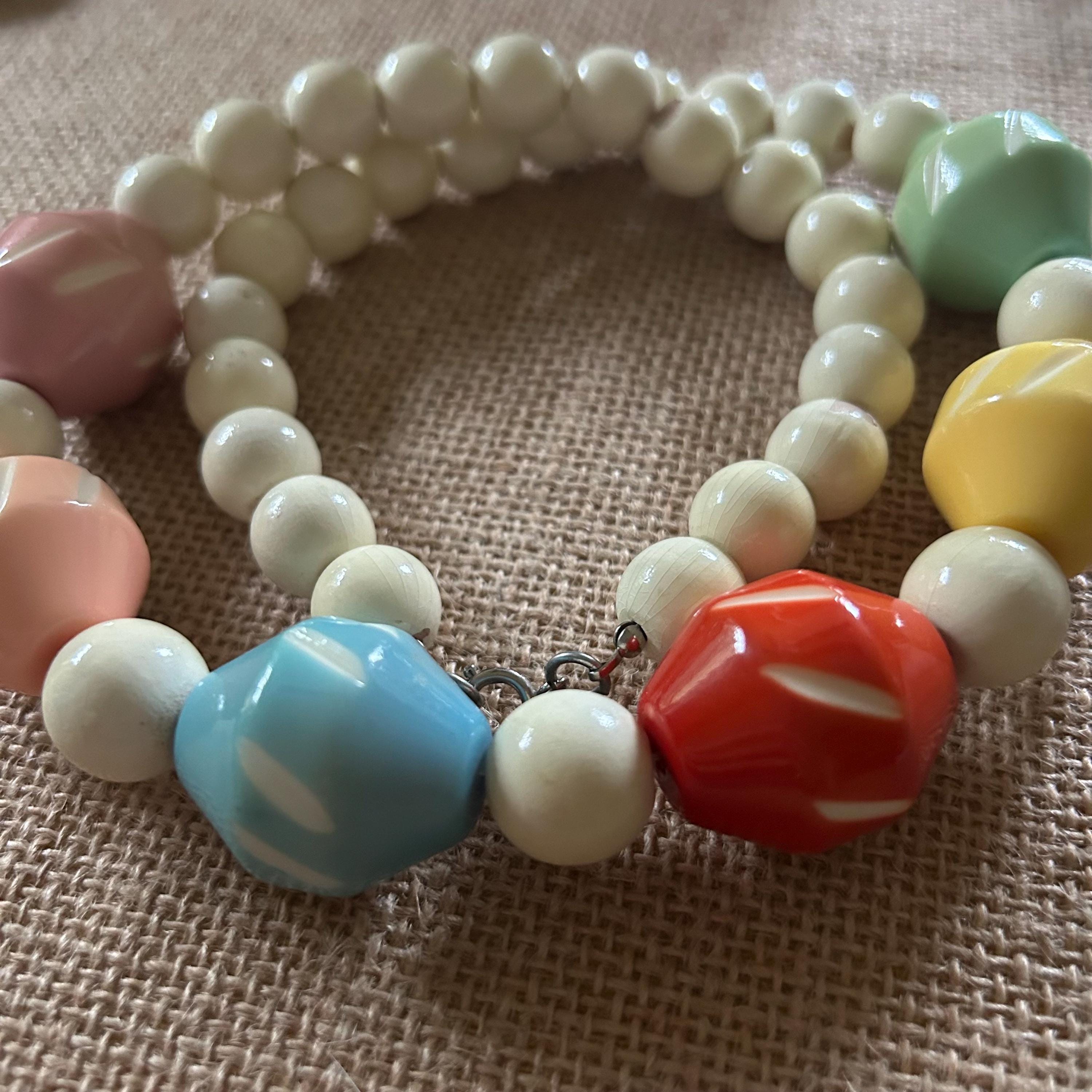 This 1950s–1960s Lucite statement necklace features glossy, faceted beads in a playful rainbow of pastels and primaries — coral, yellow, mint green, sky blue, peach, and pink — alternating with smooth cream spacer beads. The result is pure retro joy, perfect for pairing with a sundress, cardigan, or classic vintage blouse.