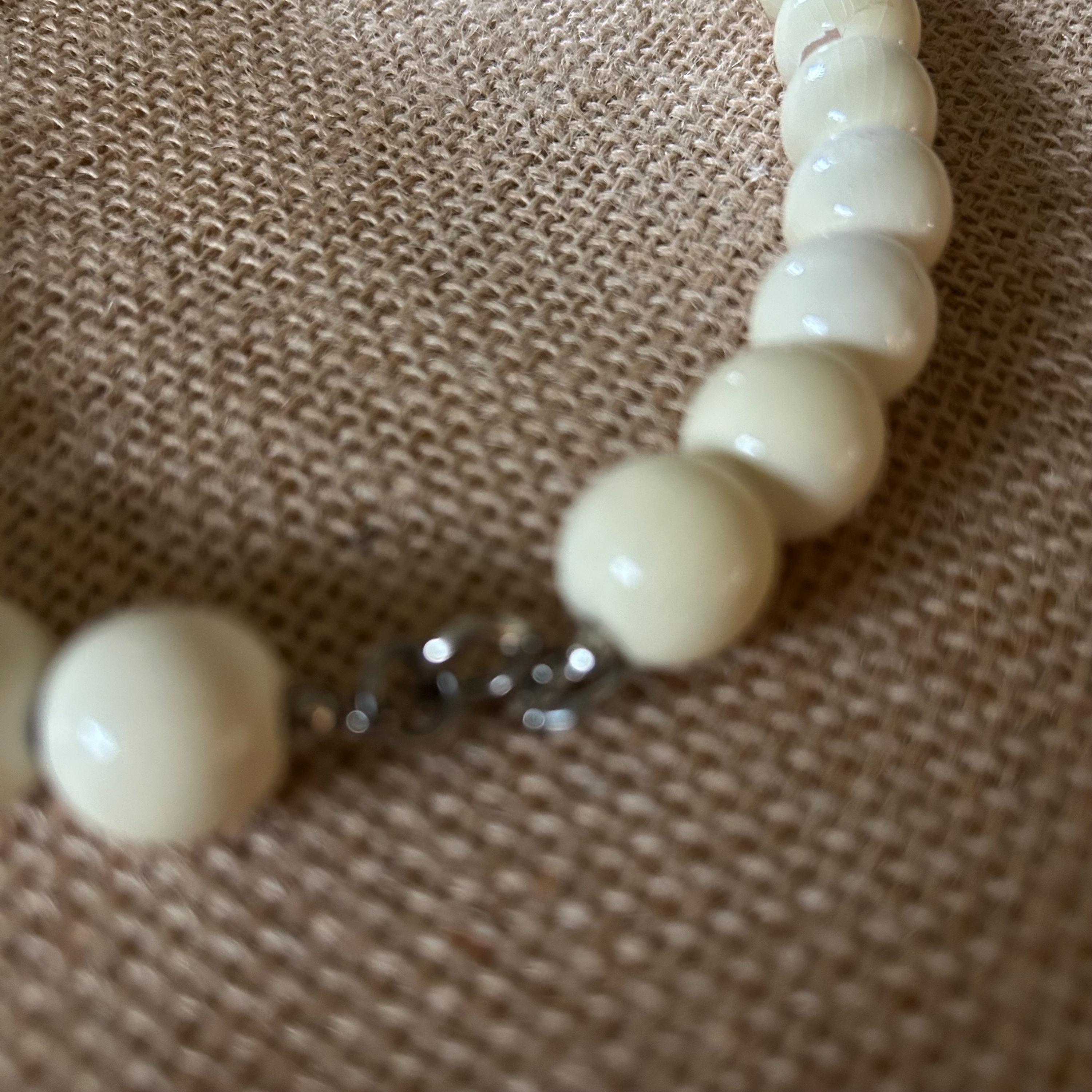 Each bead has a glossy, dimensional surface that catches the light beautifully, and the simple metal hook clasp makes it easy to wear. Whether you’re styling it for a retro look or displaying it with your vintage decor, this piece brings instant nostalgia and charm.