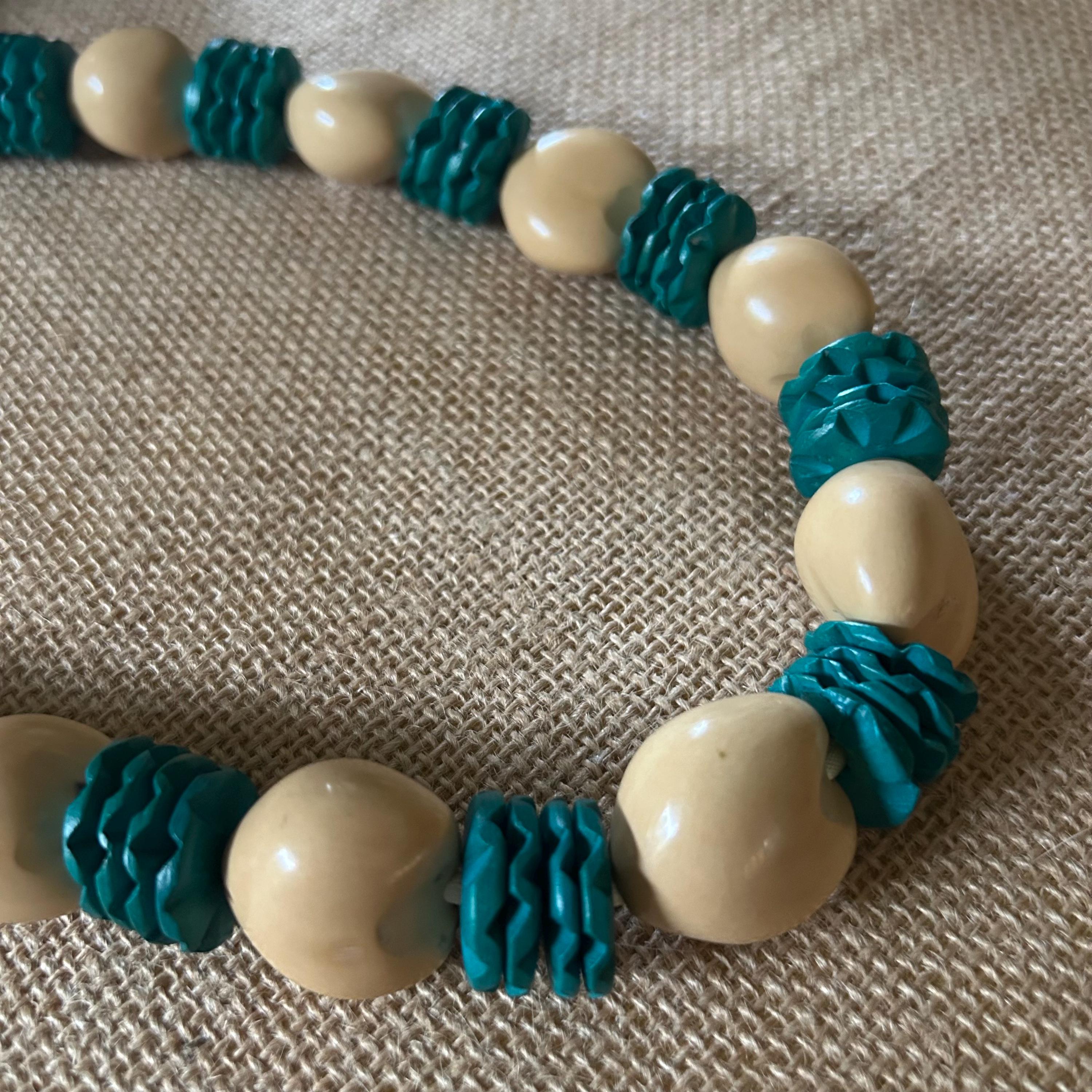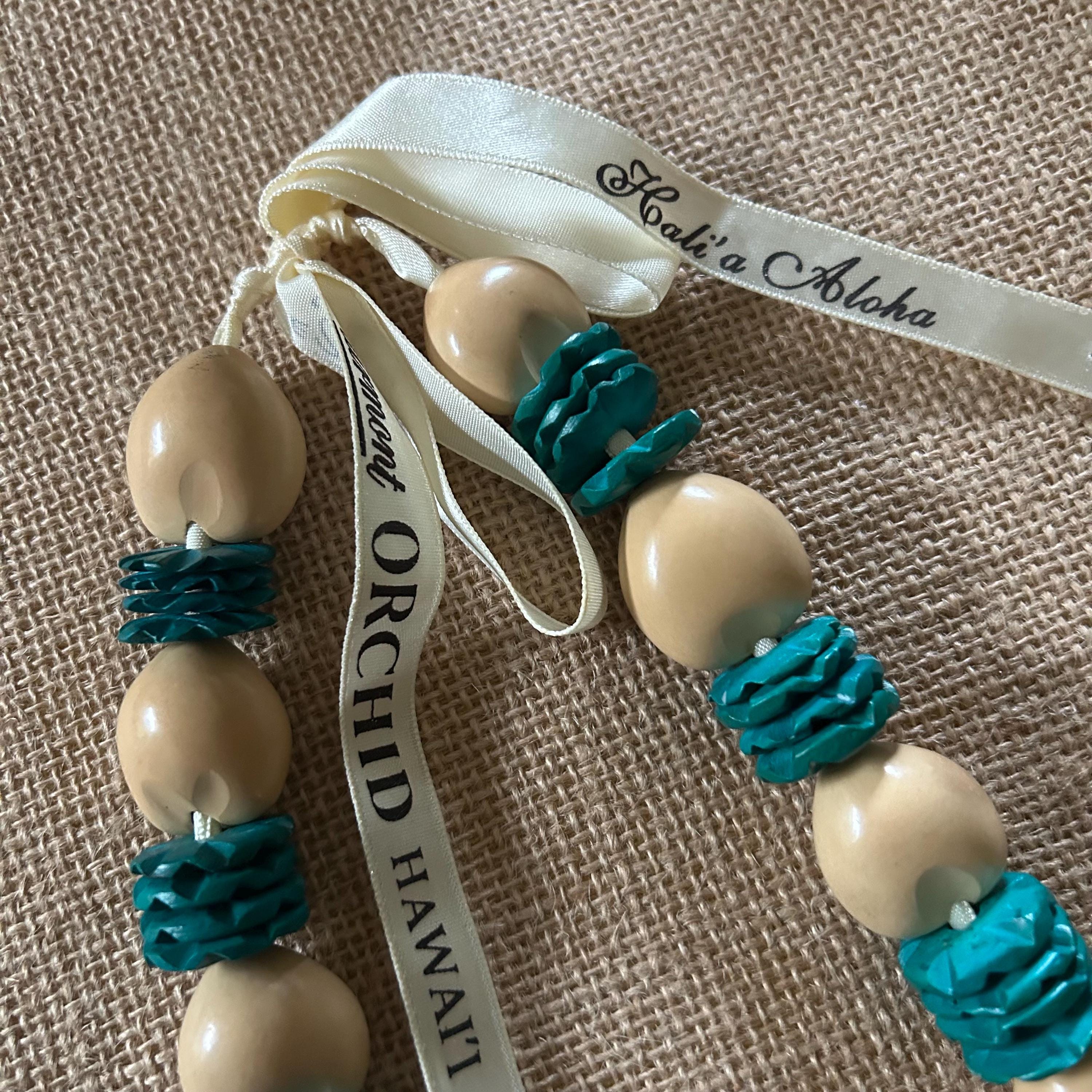 This lei features glossy tan kukui nuts—the traditional nuts of the Hawaiian state tree—paired with textured teal spacers and soft cream ribbons for a classic resort presentation. Originally given to guests as a token of welcome and aloha, it now makes a lovely decorative accent, photo prop, or nostalgic travel collectible.
