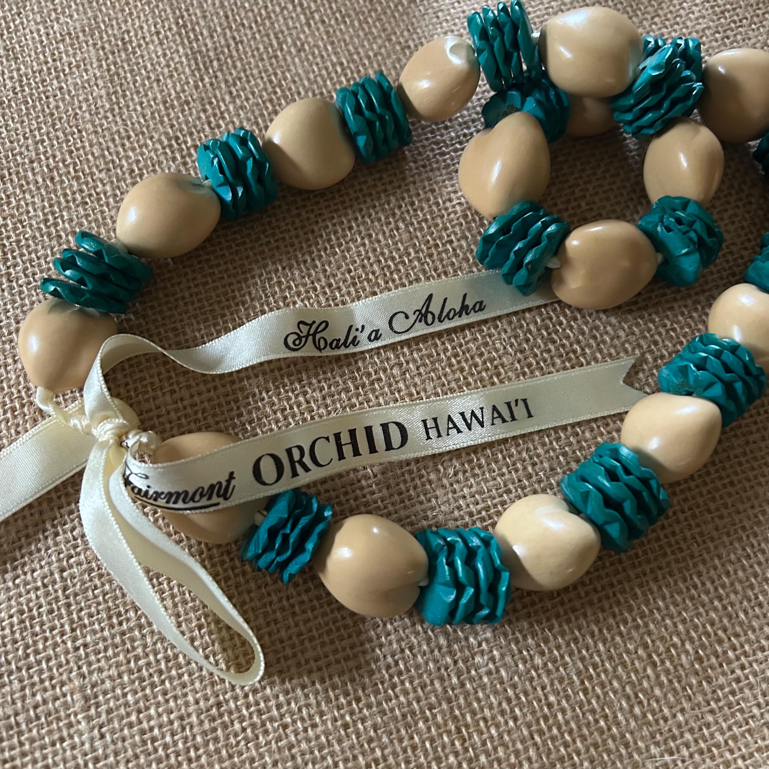 Bring a little island warmth home with this elegant kukui nut lei from Fairmont Orchid Hawai‘i, accented with satin ribbons reading “Hali‘a Aloha” (meaning “fond memories of love”).