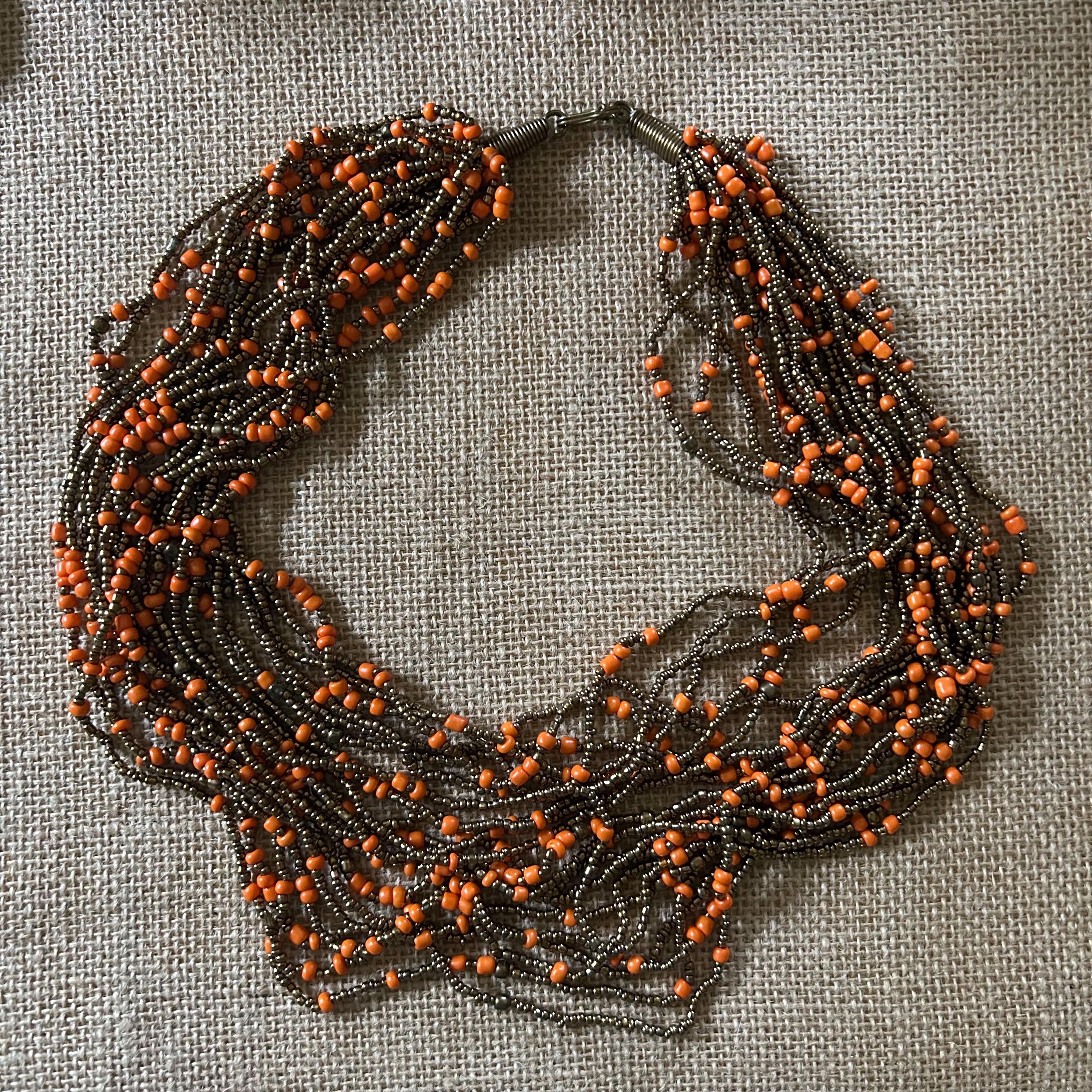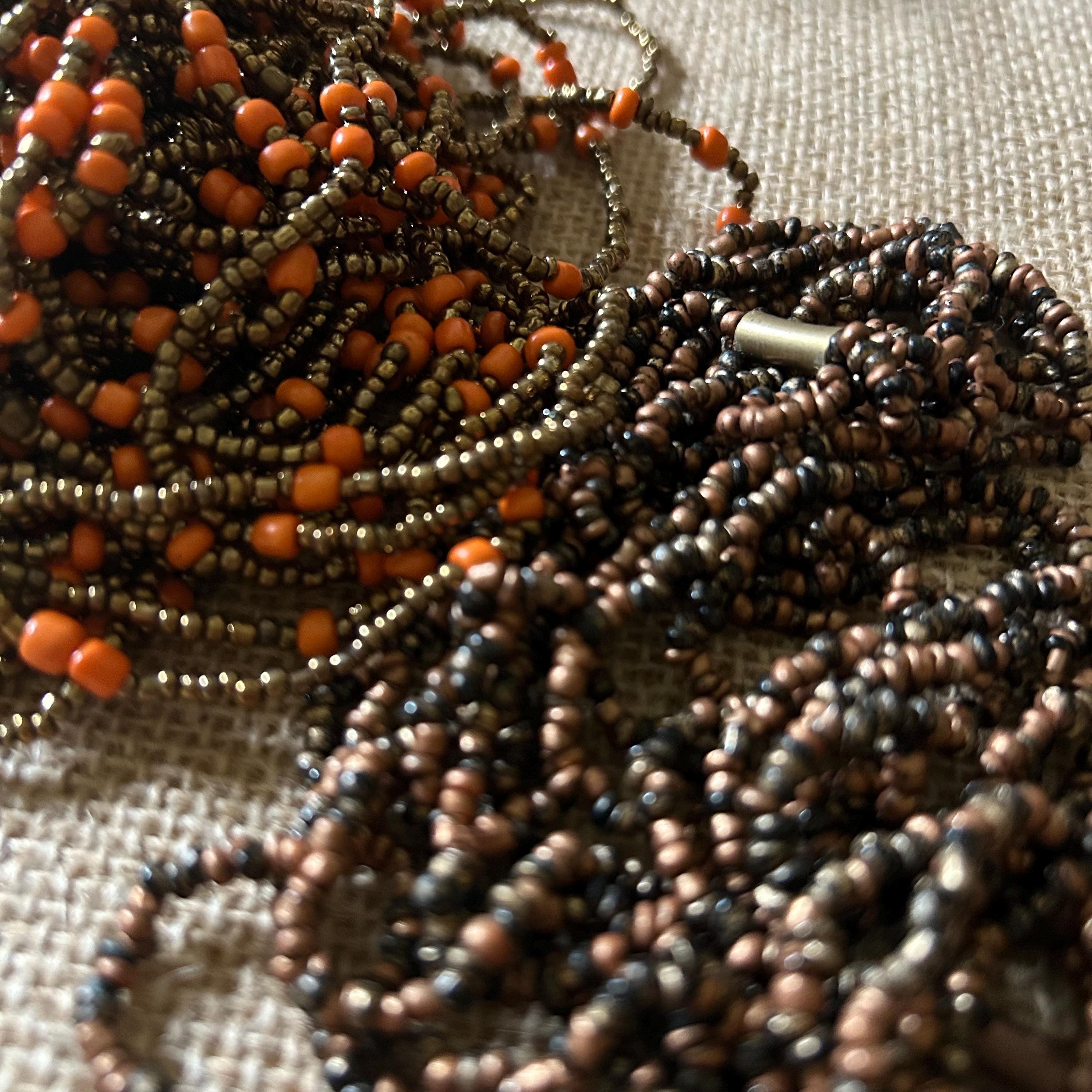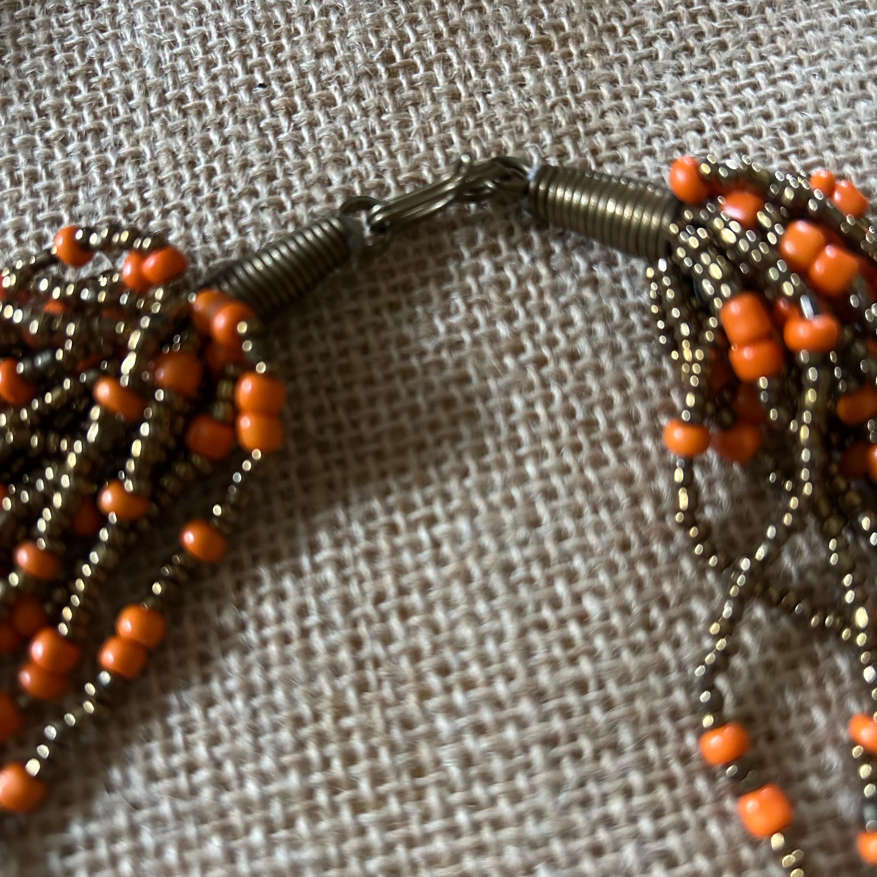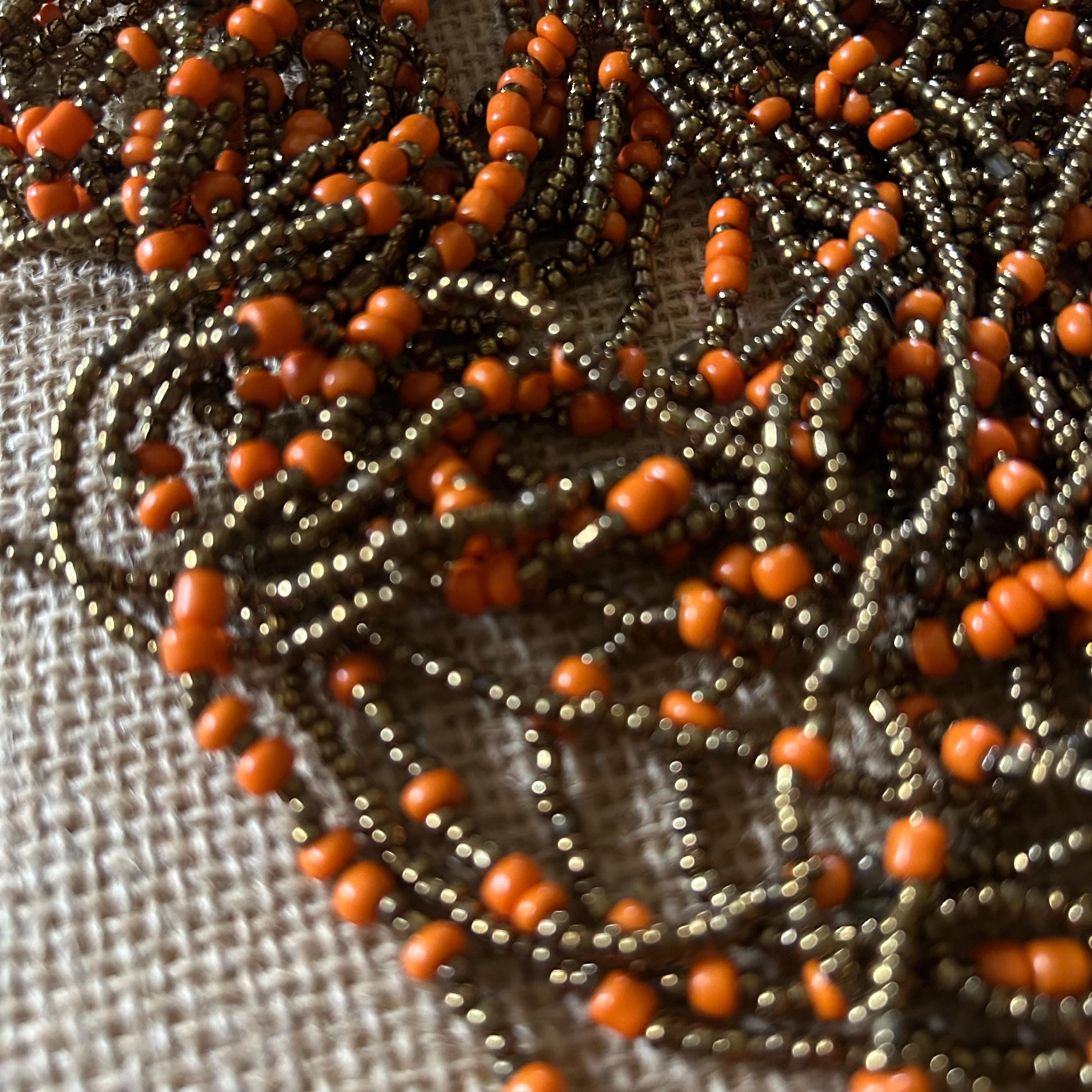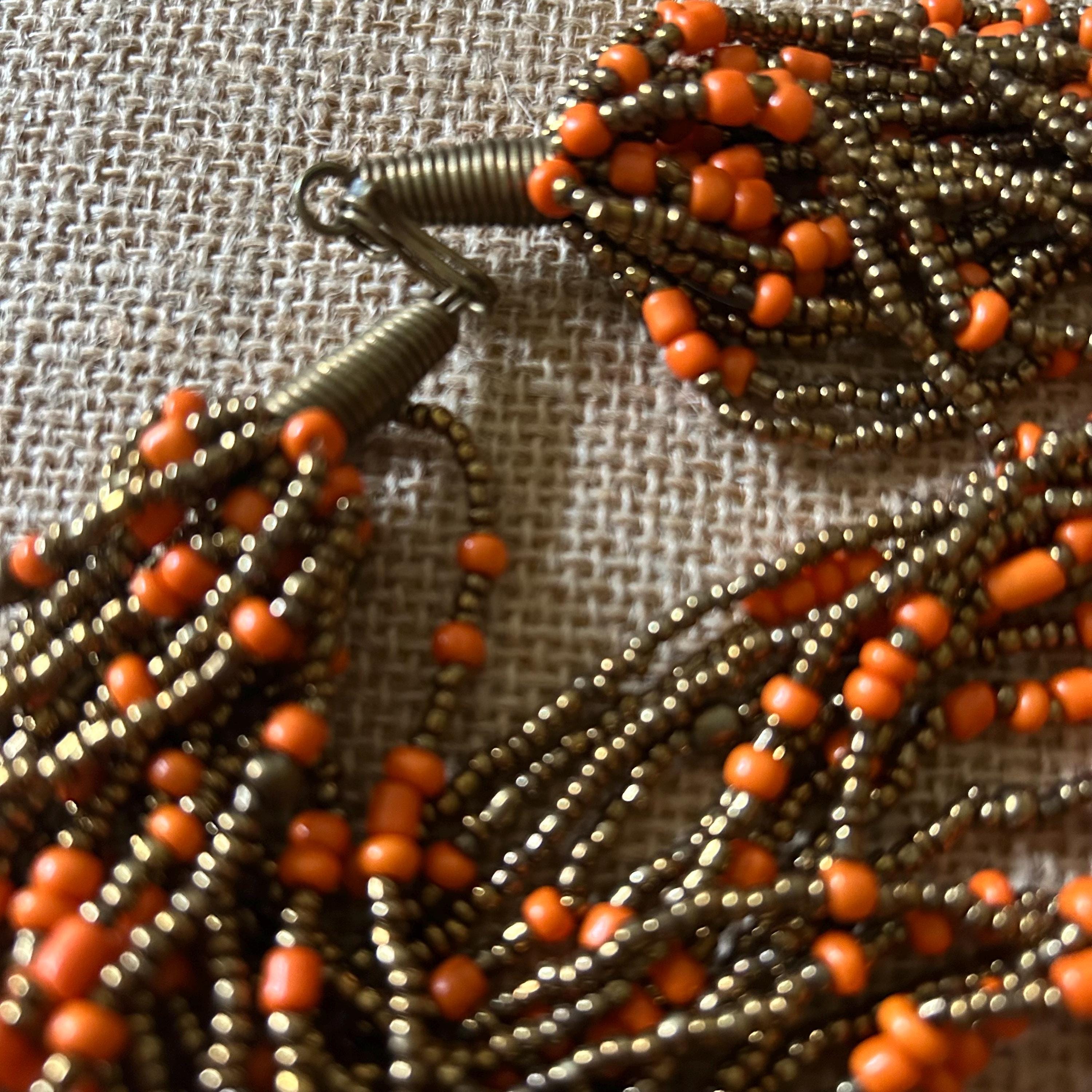 Make a bold, bohemian statement with this vintage multi-strand seed bead necklace featuring vibrant orange glass beads mixed with antique brass metallics.