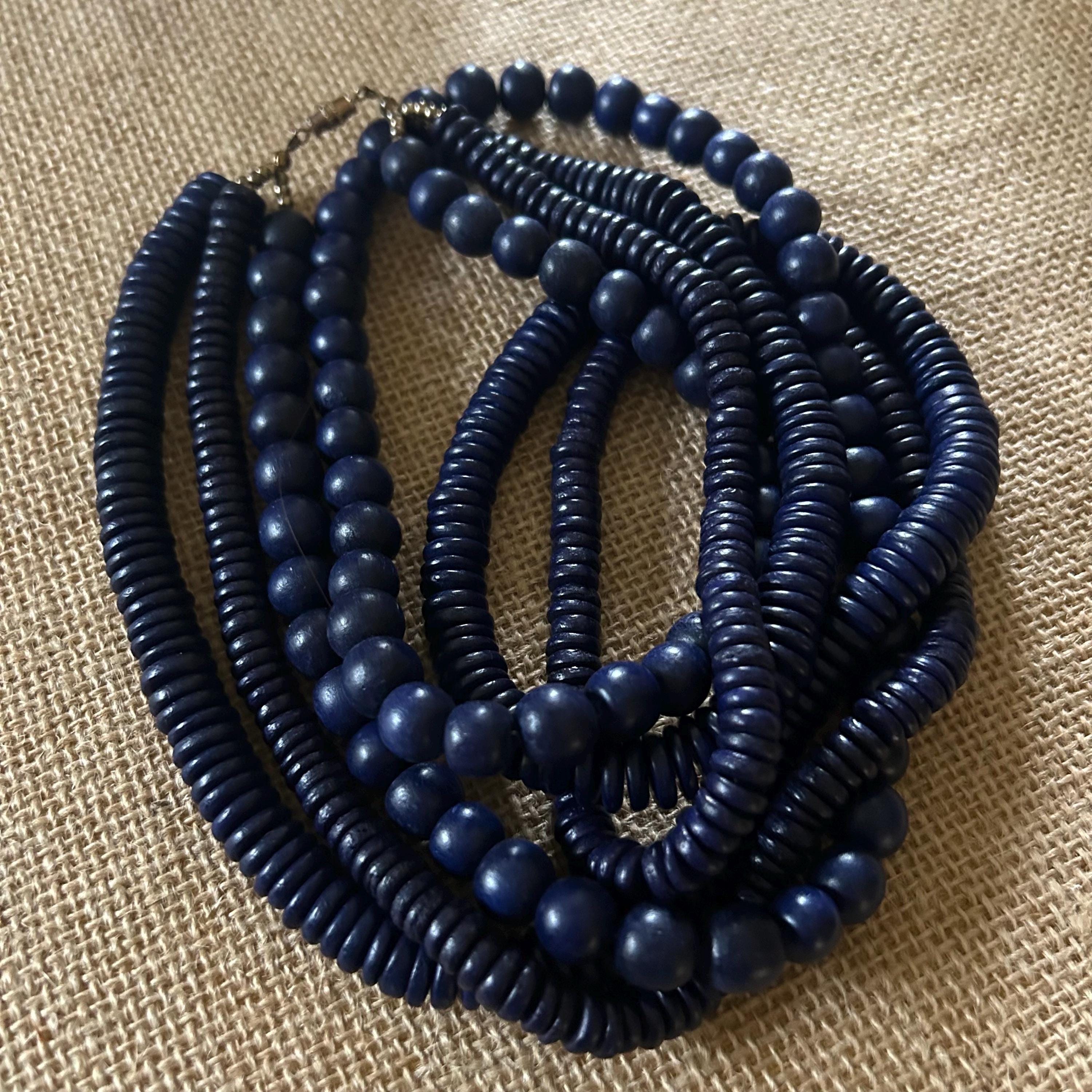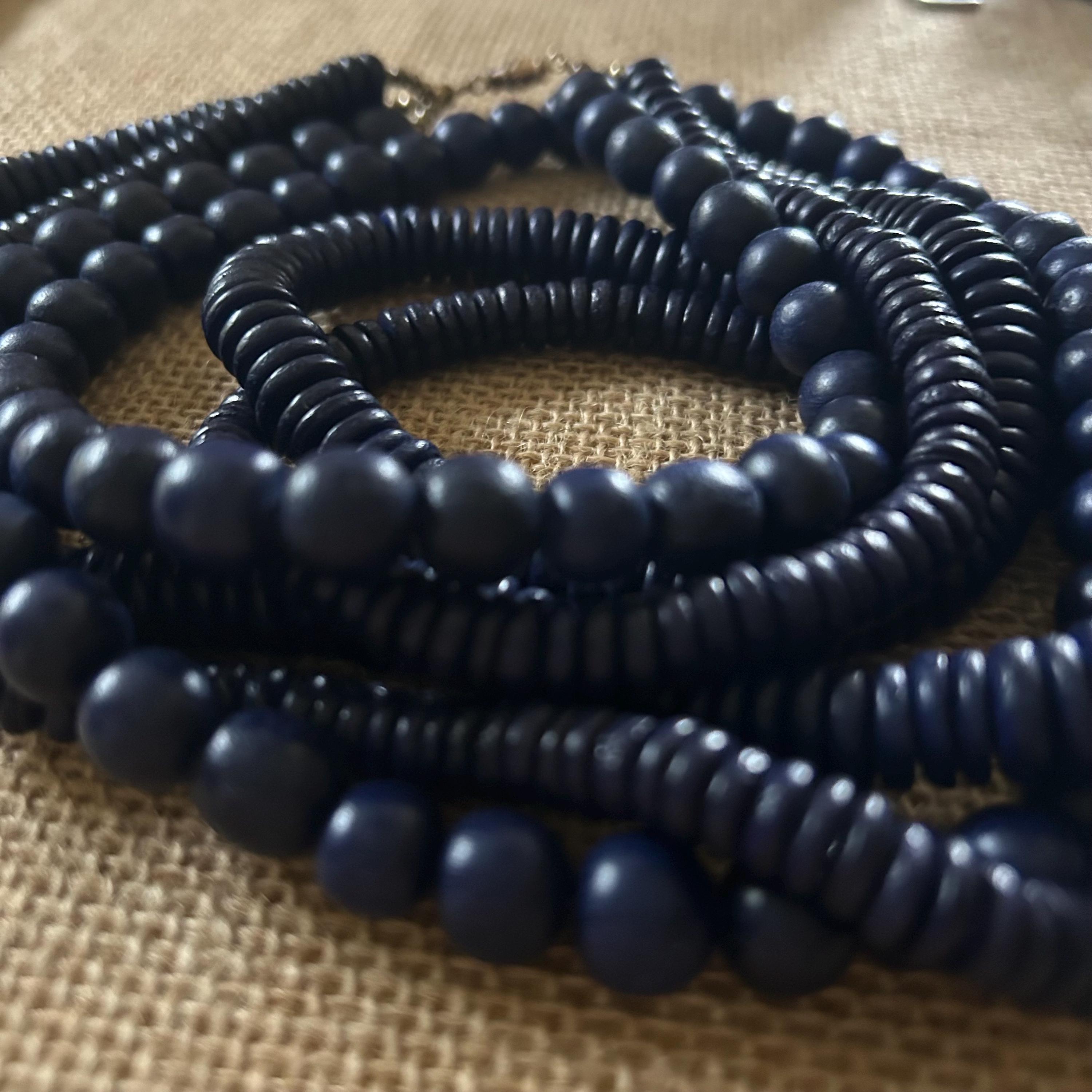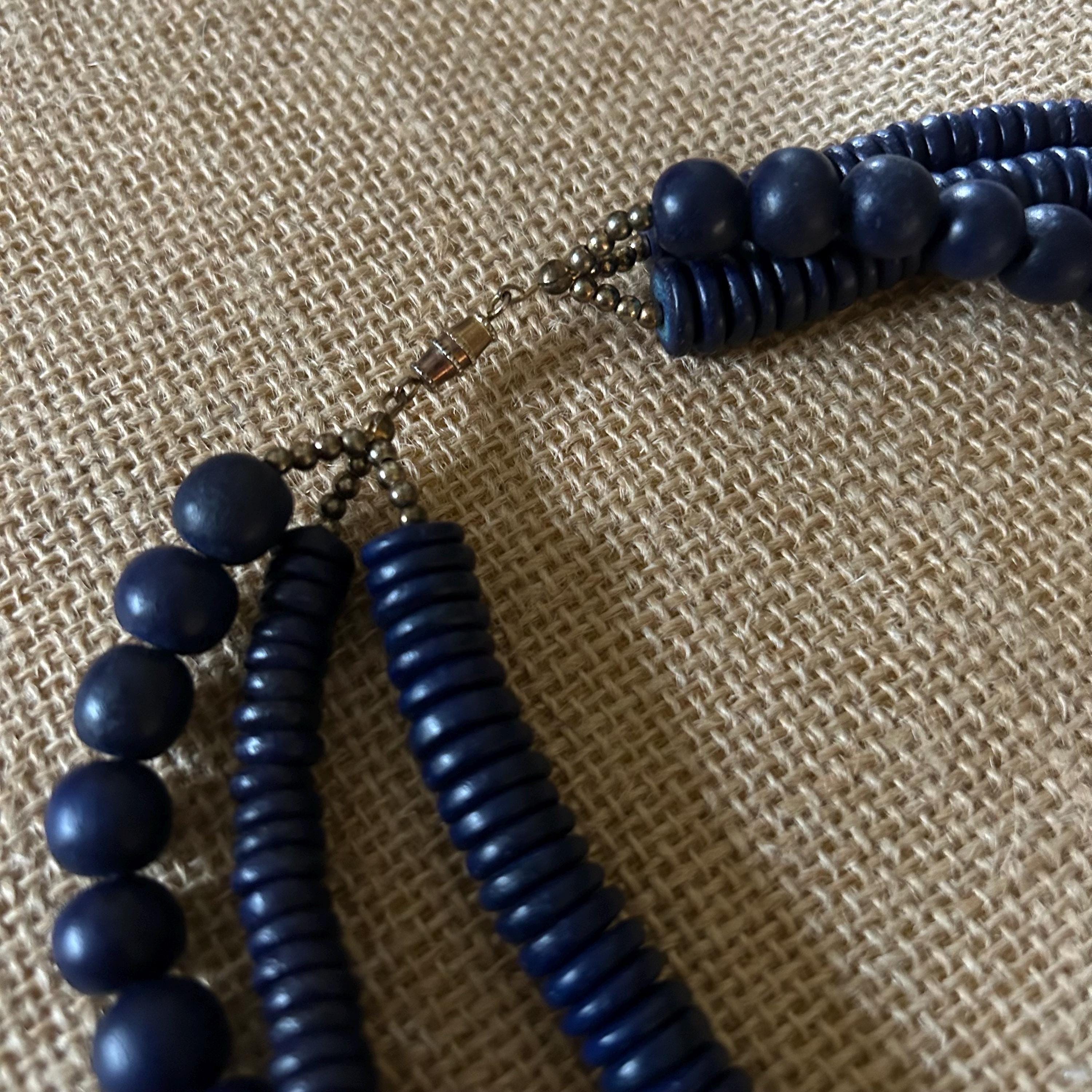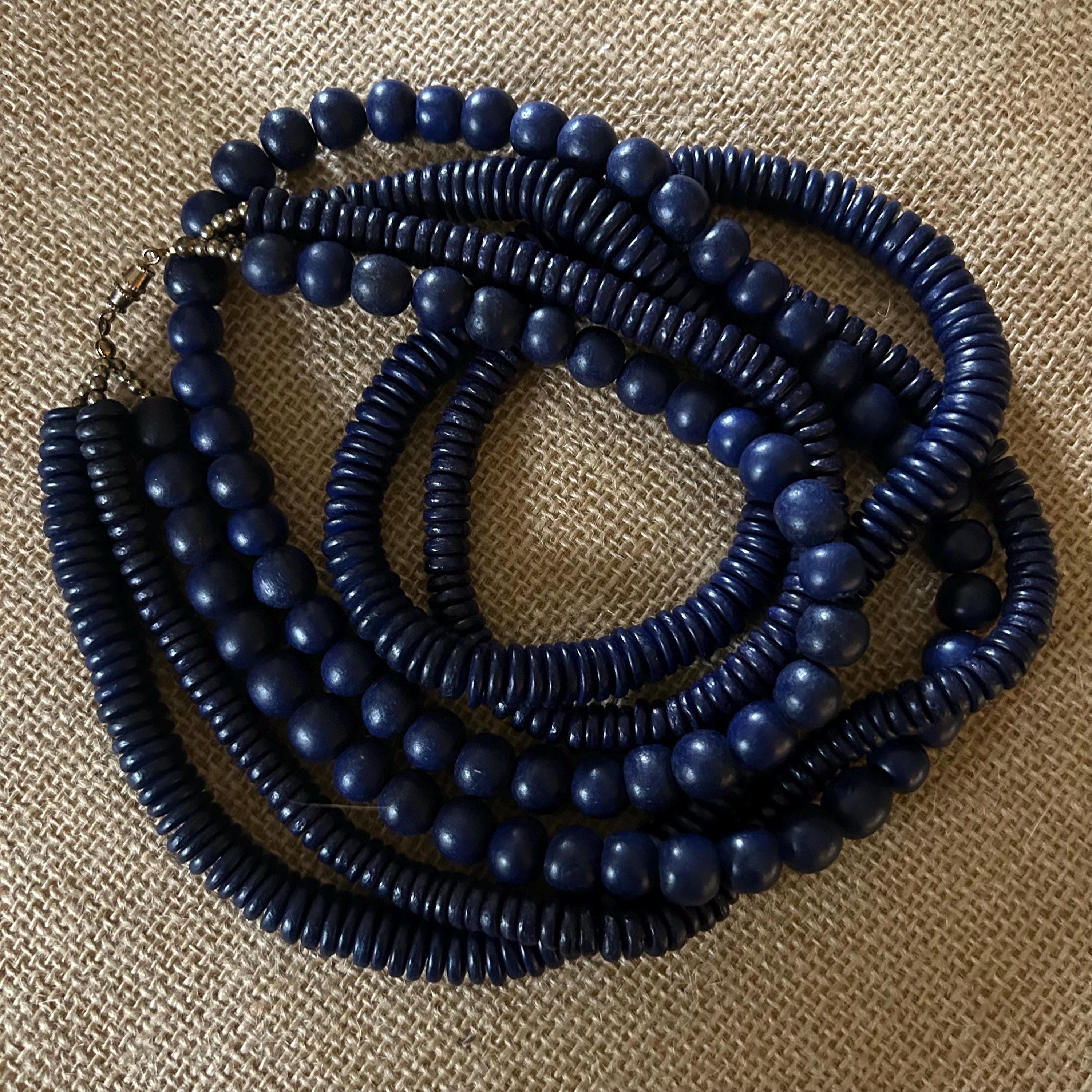 Deep, moody navy meets natural texture in this vintage 1970s multi-strand wood bead necklace from Betty and ZZ Vintage.