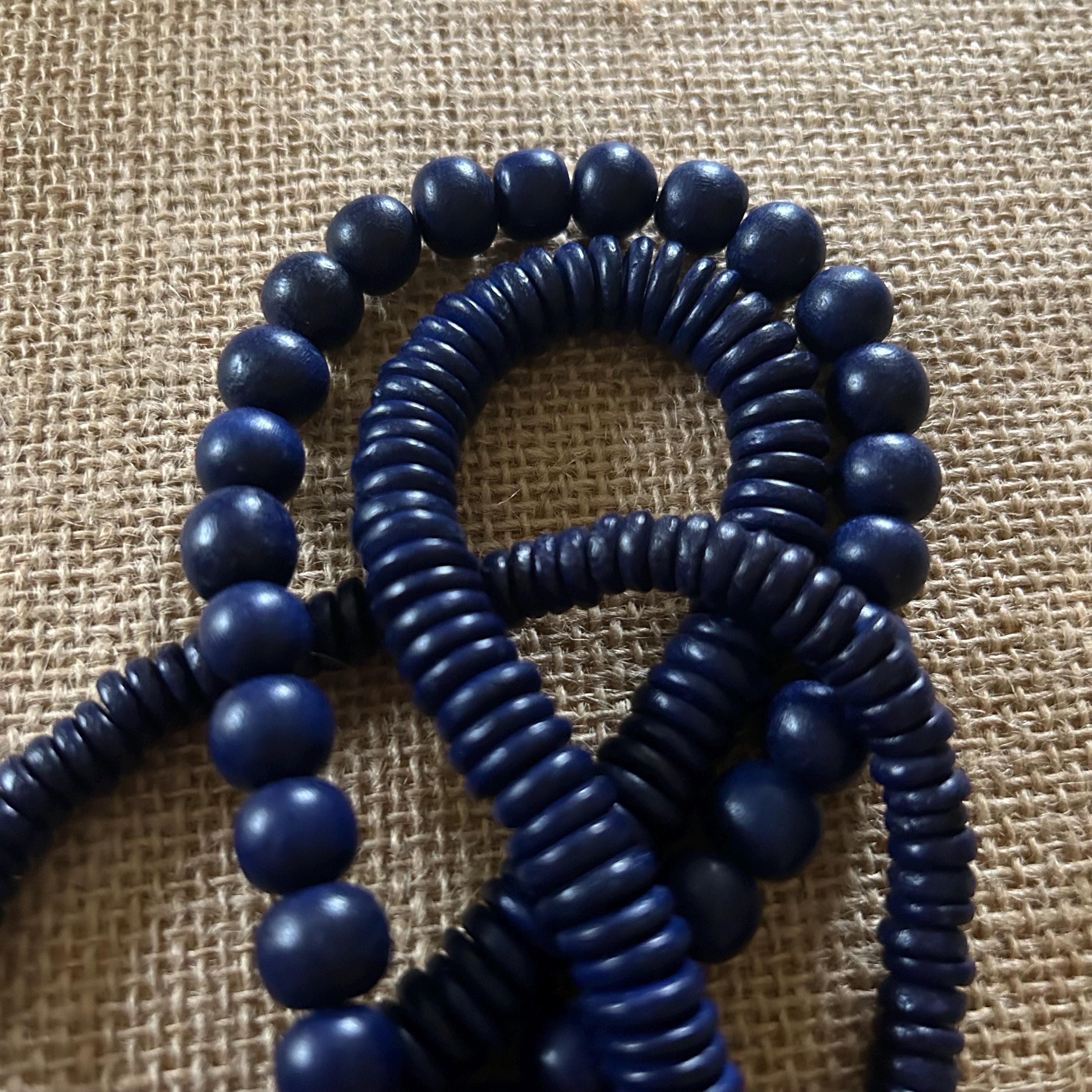 This striking piece combines smooth round beads with stacked heishi-style disks for an effortlessly bold bohemian look. The matte indigo finish gives it depth and versatility—perfect layered over linen, denim, or a crisp white blouse. Each strand is lightweight and organically shaped, connected with a classic barrel clasp that was standard in mid-century wooden jewelry.