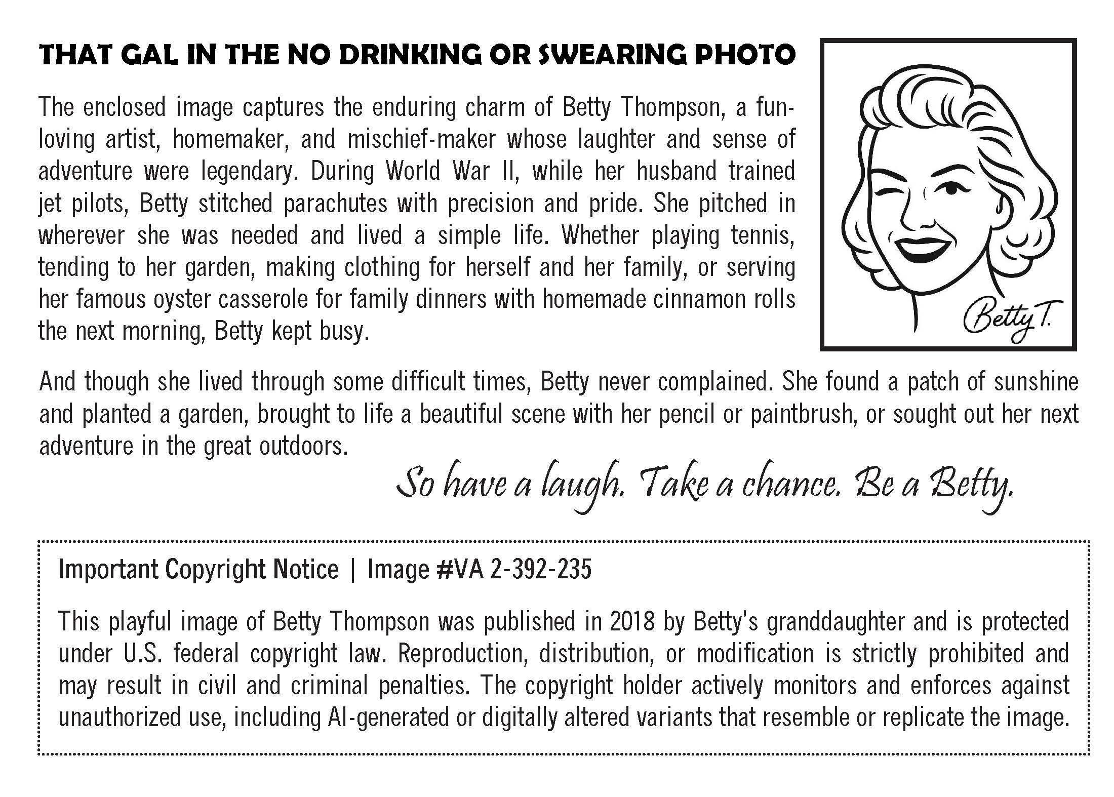 Thank you to our loyal customers for purchasing your authorized copy of this beloved photo of Betty made from the original image via this shop ONLY. There is no higher quality version available anywhere. All similar photographs or artistic renditions have been pirated or produced by a skilled graphic designer or AI. Contrary to popular belief, this photo is not Prohibition era, as that time in history spanned the years from 1920 to 1933, when the US prohibited the production, import, transport, and sale of alcohol.