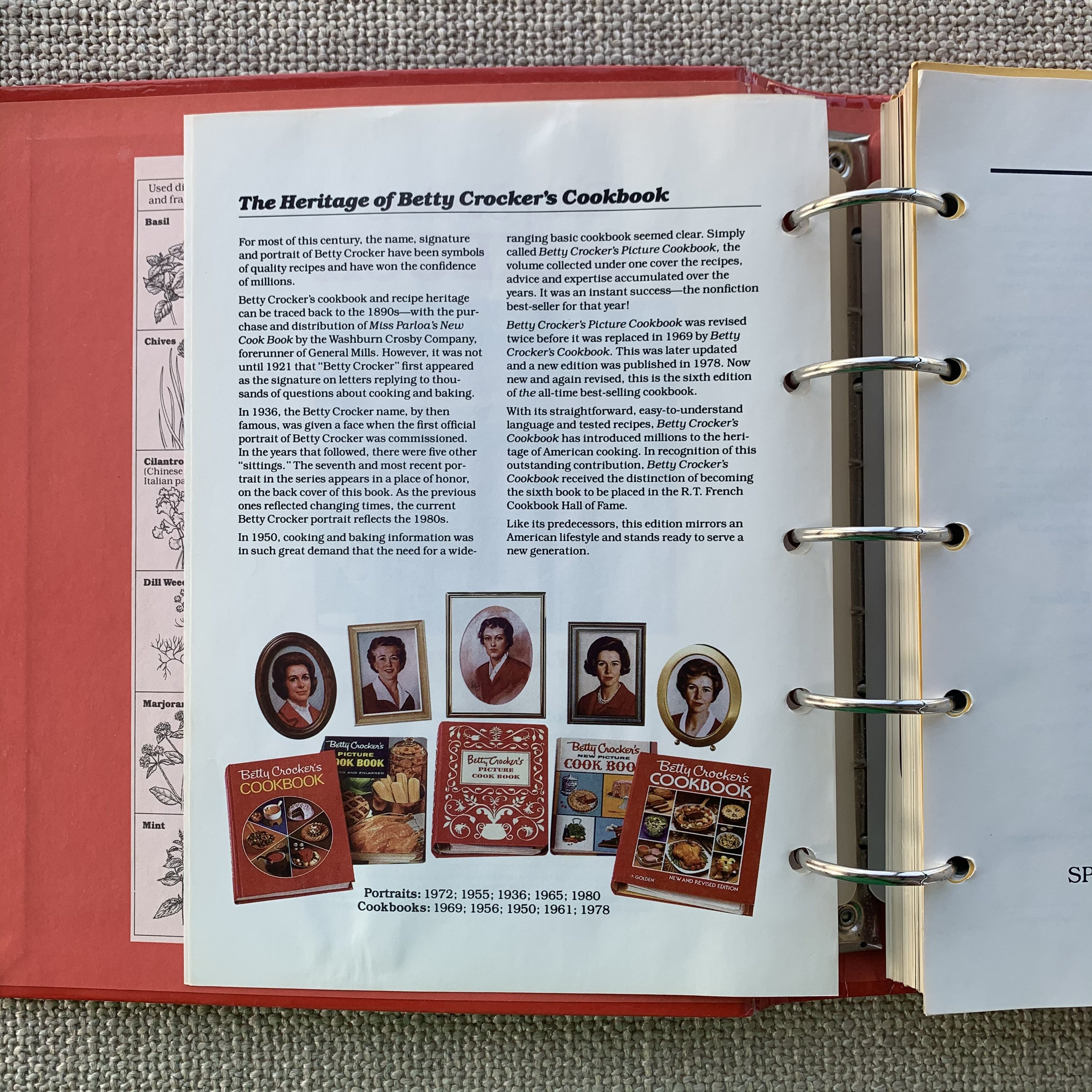 Vintage Betty Crocker Cookbook tabbed binder with classic red cover published in 1986. Recipes for breads, cakes, candies, pasta, stews, sauces, relishes and more. Make homemade soda pop, Bavarian pretzels, and other food dishes and beverage treats that will become family favorites. Prepare Oysters Rockefeller and an easy wine spritzer for your next party.
